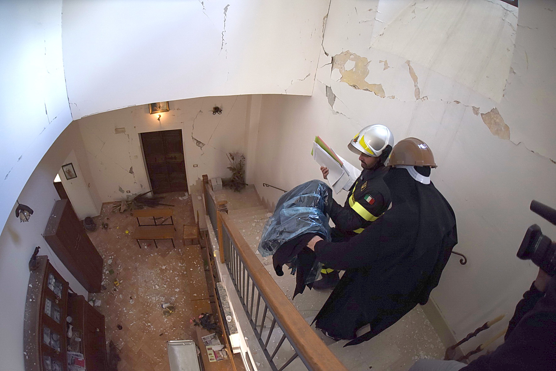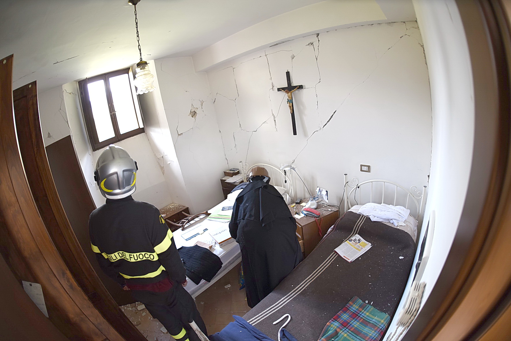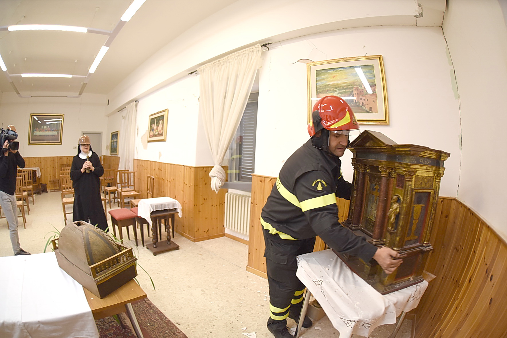 In questa missione non sono soli. Con loro anche le monache benedettine del locale monastero di sant’Antonio Abate. Come conferma suor Caterina Corona, badessa della comunità: “questo terremoto può diventare un’opportunità per rinascere. San Benedetto ci indica la via. Egli ha saputo vivere in concretezza il Vangelo e la sua eredità spirituale e umana ci insegna che anche in questa nostra storia tragica si incarna la salvezza di Dio. Da qui la speranza che questa terra risorgerà più forte”. La badessa parla mentre con cura, aiutata dai Vigili del Fuoco, porta fuori del monastero ormai inagibile, il tabernacolo ligneo con il Santissimo Sacramento, rimasto illeso dal crollo, come la piccola statua marmorea della Madonna, rimessa in piedi sulla terrazza. Il tempo di un’Ave Maria e di nuovo dentro l’edificio pieno di crepe a recuperare alcuni oggetti personali, libri, computer e abiti di ricambio per le monache. Poi una corsa nell’orto dove le suore hanno ancora gli alveari. “Purtroppo – dice la badessa – molte api sono morte. Ma gli alveari possono attendere. Ora c’è da pensare alla comunità e agli abitanti di Norcia rimasti senza casa”. Alcuni di loro attendono con pazienza che i Vigili del Fuoco li portino in sicurezza nelle loro abitazioni lesionate per prendere tutto il possibile”. Intorno l’atmosfera è irreale, ferma a domenica, al momento della scossa. Madre Caterina lo sa bene e ripete la sua preghiera: “Posiamo sguardi ed energie su ciò che vale e non tramonta. Che questa tragedia possa essere un’opportunità di rinnovamento di vita e, per chi crede, di fede. Un’opportunità anche per l’Europa. Che guardi ai valori umani, non solo cristiani, e lavori per la dignità dell’uomo, così come fecero Benedetto da Norcia e i suoi monaci dal VI secolo ad oggi”.