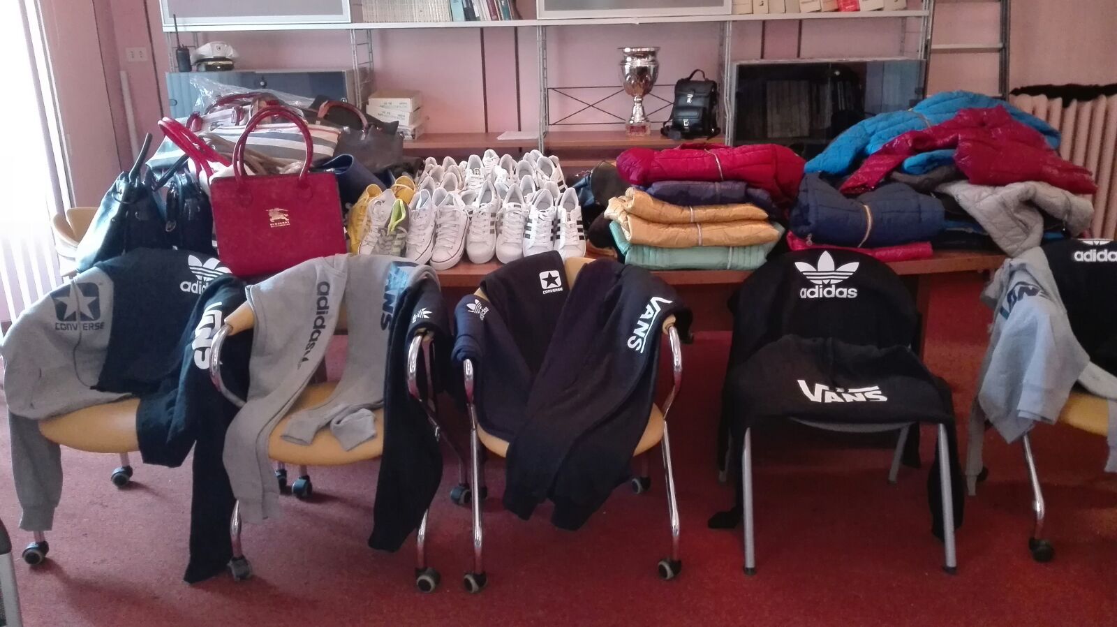 Ingente il materiale sequestro: si tratta di 32 borse da donna, 37 paia di scarpe, 25 piumini, 39 maglie da uomo, 8 giacche in felpa e 7 pantaloni in felpa per un valore stimato di qualche migliaio di euro.