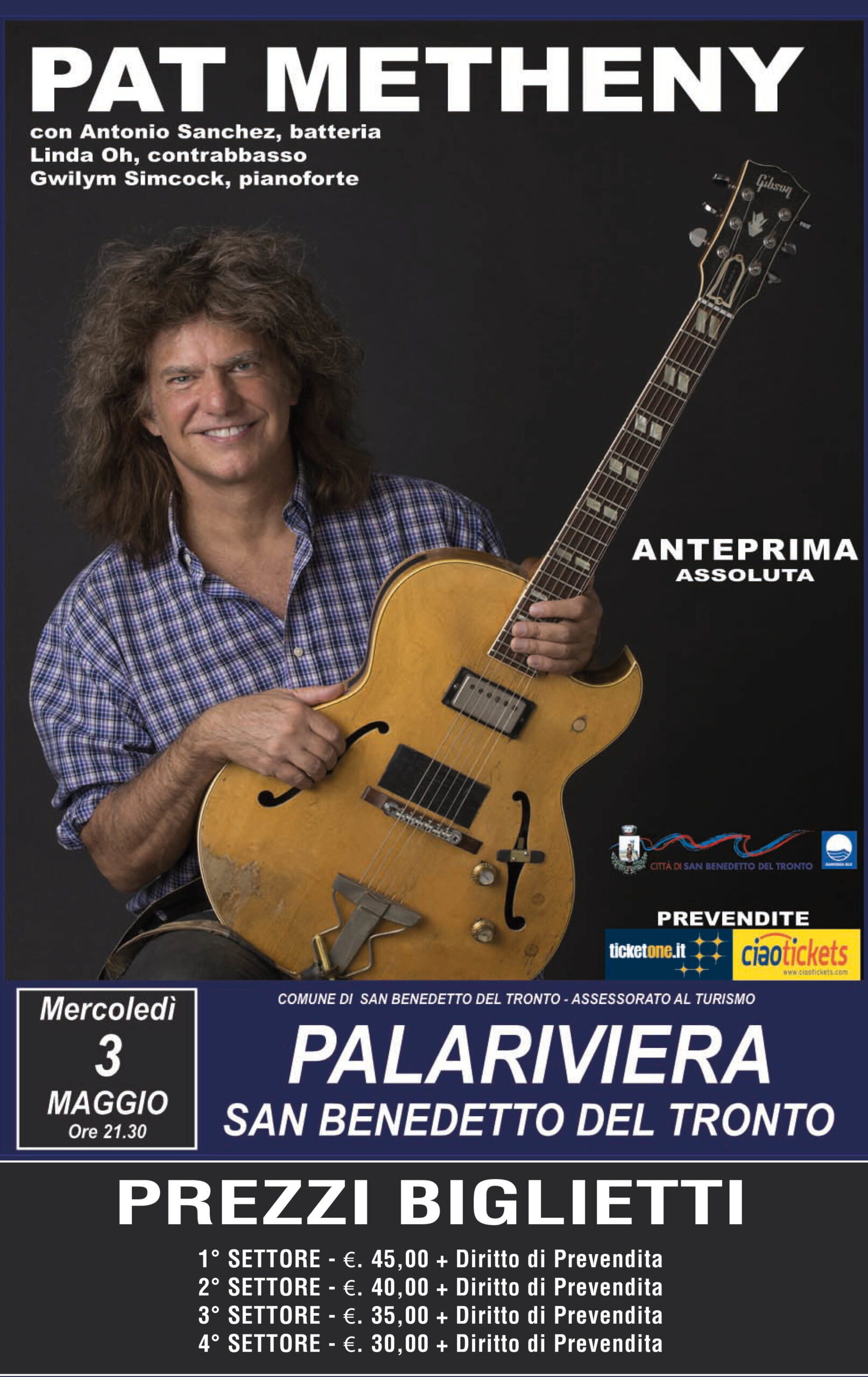 SAN BENEDETTO DEL TRONTO – Il 3 Maggio la città di San Benedetto del Tronto ospiterà la prima mondiale dell’attesissimo nuovo tour di Pat Metheny colosso della Musica jazz. Seguiranno poche date in Italia e poi il tour proseguirà a livello internazionale. Metheny arriverà in città qualche giorno prima per perfezionare le prove del tour e preparare il debutto del 3 maggio. Una grande occasione anche di visibilità per la città di San Benedetto, realizzata grazie all’organizzazione di Monica Spadoni con il sostegno dell’Amministrazione comunale.