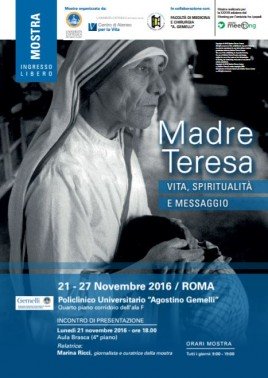 Lunedì 21 novembre, alle ore 18.00 nell’Aula Brasca del Policlinico Gemelli si inaugura la mostra fotografica “Madre Teresa – Vita, spiritualità e messaggio” promossa dal Centro di Ateneo per la vita dell’Università Cattolica e dall’associazione Ateneo studenti in collaborazione con la facoltà di Medicina e chirurgia e con la Fondazione Policlinico. Il significato della mostra sarà illustrato dalla giornalista e scrittrice Marina Ricci, che l’ha curata.La mostra, allestita presso la hall del Gemelli, potrà essere visitata gratuitamente dal 21 al 27 novembre, ore 9.00 – 19.00.