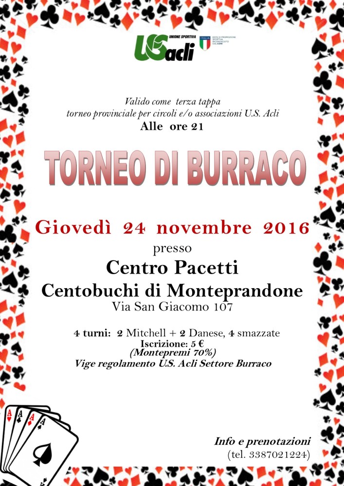 MONTEPRANDONE – E’ giunto alla terza tappa il Torneo provinciale a squadre di burraco dell’U.S. Acli con un nuovo appuntamento che si svolgerà giovedì 24 novembre alle ore 21 presso il Centro Pacetti in via San Giacomo 107.