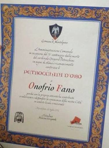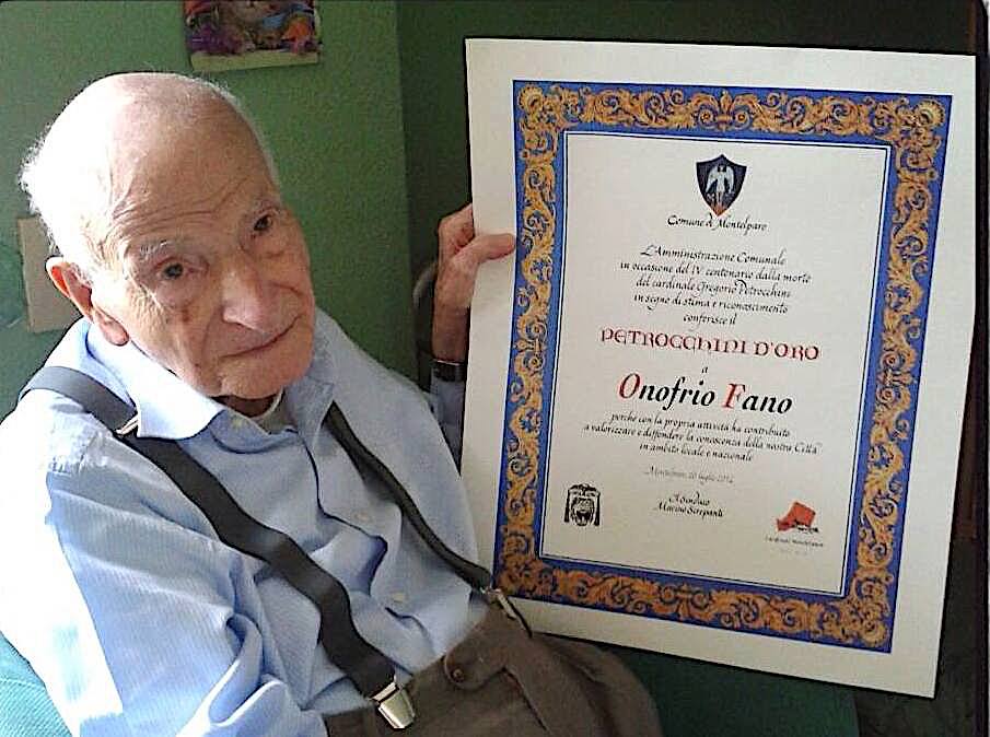 In coincidenza del compimento dei suoi 100 anni, nel 2014, l’Amministrazione Comunale di Montelparo insignì il “Maestro Fano” del premio “Montelparese dell’Anno”, istituito nel 2012 per ricordare e commemorare i 400 anni dalla morte del Cardinal Gregorio Petrocchini (camerlengo di Papa Sisto V°): mai premio fu tanto giusto!
