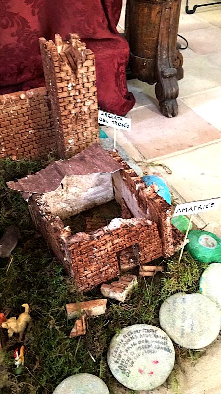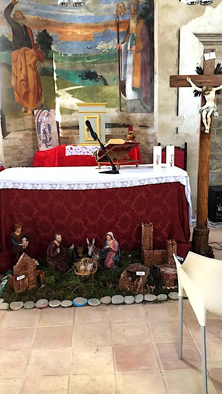MONTELPARO – I fedeli, che hanno partecipato alla Santa Messa domenicale nella Chiesa dei Santi Pietro e Silvestro, sono rimasti sorpresi e meravigliati dal particolare presepe realizzato dai ragazzi che frequentano il Catechismo. L’hanno sistemato proprio davanti all’improvvisato altare di questo luogo pieno, sì, di storia e di fascino, ma che è stato restaurato recentemente per ospitare un’originale e preziosa sala convegni. In questo periodo è l’unica possibilità che la Parrocchia di San Michele Arcangelo ha per celebrare cerimonie religiose vista la perdurante inagibilità di tutte le chiese del centro storico di Montelparo.