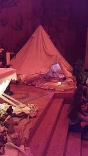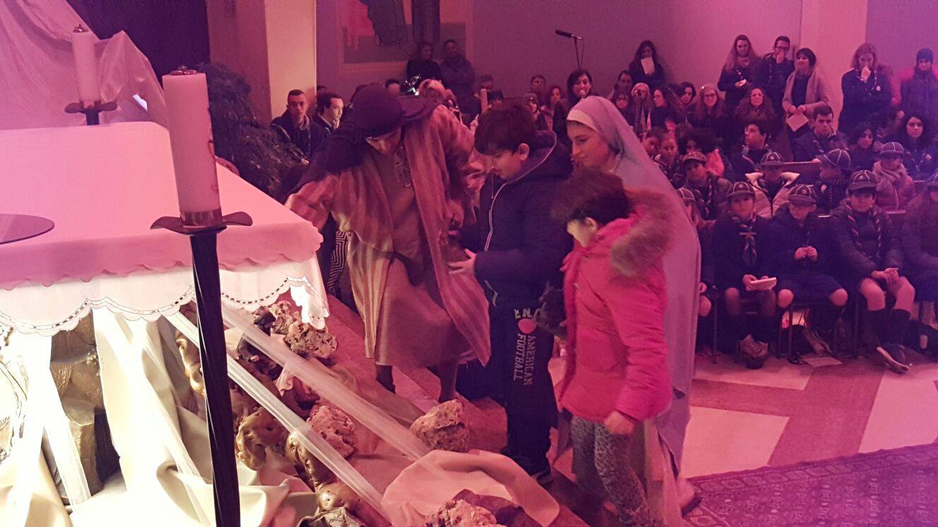 Infine il presepe, composto dai vari personaggi condotti dai bambini portati fino all’altare: all’arrivo dei magi sono stati consegnati loro alcuni doni e delle piccole statuine di Gesù bambino. Era presente nel presepe anche un pastore moderno, con una valigia 24 ore e in giacca e cravatta (quest’ultima tra l’altro piena di smiles, proprio per esorcizzare la vera felicità) che non aveva tempo per pensare a Dio e alle persone che aveva intorno e che quindi passa velocemente davanti e oltre questa natività.