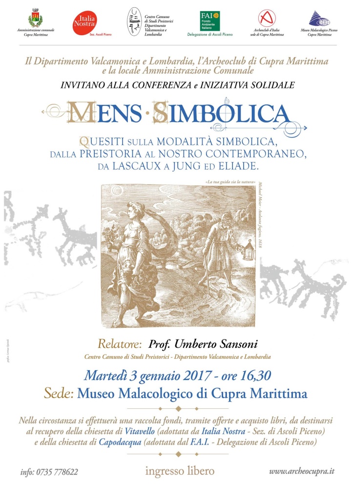 CUPRA MARITTIMA – Oggi, martedì 3 gennaio 2017, ore 16,30, presso il Museo Malacologico (via Adriatica nord, 240) di Cupra Marittima si terrà un’iniziativa solidale volta al recupero di due monumenti gravemente lesionati dal recente sisma. Si tratta di una conferenza organizzata dal Dipartimento Valcamonica e Lombardia e l’Archeoclub di Cupra Marittima dal titolo “Mens Simbolica. Quesiti sulla modalità simbolica, dalla Preistoria al nostro Contemporaneo, da Lascaux a Jung ed Eliade”; il relatore, ovvero il prof. Umberto Sansoni (Centro Camuno di Studi Preistorici – Dipartimento Valcamonica e Lombardia), con la ben nota capacità di sapersi proporre ad un pubblico più vasto,presenterà in un’affascinante narrazione, i traguardi interdisciplinari emersi da recenti convegni internazionali in materia di linguaggi simbolici e strutture archetipiche. La relazione approfondisce i diversi aspetti dei sistemi espressivi che dall’invenzione delle immagini del Paleolitico superiore (quando le superfici rocciose delle grotte, dei ripari e dei massi all’aperto iniziano a popolarsi di figure tracciate con le dita, incise o dipinte) rimandano, attraverso “impronte primordiali”, all’immaginario dell’Homo Sapiens nella sua colonizzazione del mondo e all’uomo moderno.