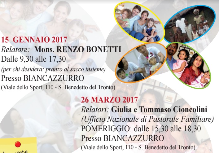 L’equipe di pastorale familiare diocesana invita tutti a “a partecipare agli incontri di formazione sull’Amoris Laetitia di domenica 15 gennaio con mons. Renzo Bonetti dalle ore 9.30 alle 17.30 e domenica 26 marzo con i coniugi Cioncolini dell’Ufficio Nazionale di Pastorale Familiare dalle ore 15.30 alle 18.30.