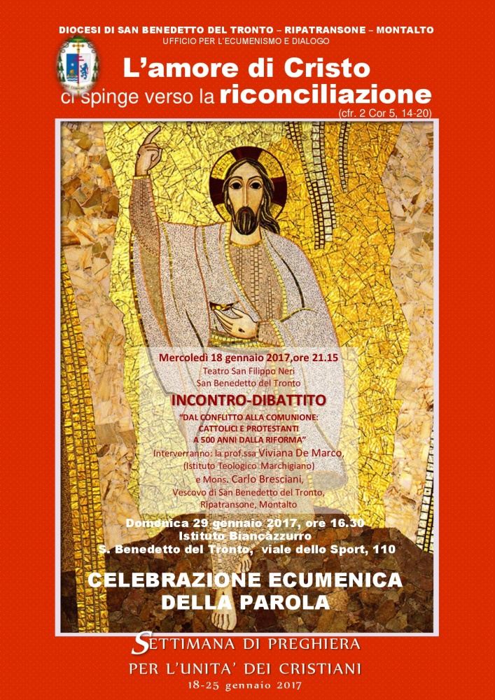 1. mercoledì 18 gennaio 2017, dalle ore 21.15, presso il Teatro “San Filippo Neri” in San Benedetto del Tronto, incontro-dibattito sul tema: “DAL CONFLITTO ALLA COMUNIONE: CATTOLICI E PROTESTANTI A 500 ANNI DALLA RIFORMA. Il cammino ecumenico della Chiesa Cattolica dal Concilio Vaticano II ad oggi”.  Interverranno la prof.ssa Viviana De Marco, docente dell’Istituto Teologico Marchigiano, e Mons. Carlo Bresciani, Vescovo della Diocesi di San Benedetto del Tronto-Ripatransone-Montalto;