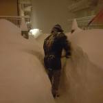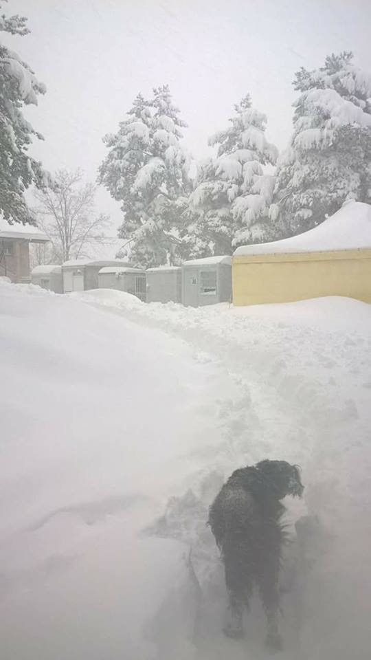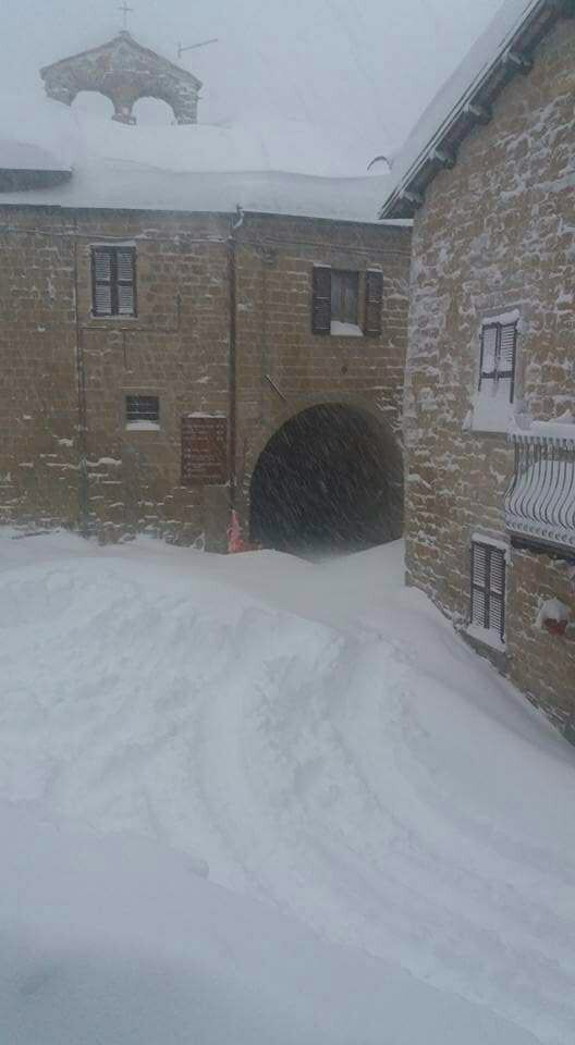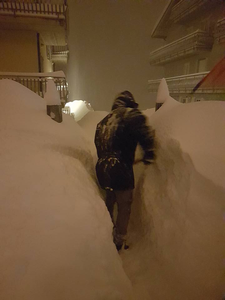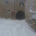 “Questo è l’ingresso di una casa montemonachese riparato (si fa per dire) da una tettoia. Forse abbiamo reggiunto, o sfiorato, il metro e mezzo di neve. Chi lo sa? La cosa certa è che nevica ancora e che, anche noi, come altre trecentomila persone tra Marche e Abbruzzo, siamo senza corrente elettrica da questa notte.