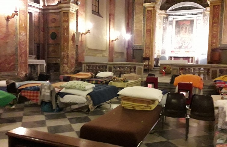 Un letto è sistemato perfino all’ingresso, di traverso, accanto al confessionale. Letti anche in sacrestia e in una stanza adiacente, nello spazio separato per le donne. Tra uno e l’altro diverse stufe a gas, che rendono l’ambiente confortevole e accogliente. I bagni chimici però sono all’esterno. Un centinaio di volontari, a turni di quattro o cinque ogni sera, si occupano dell’accoglienza. La sera parlano con gli ospiti, ascoltano i loro bisogni, fissano le visite mediche, li aiutano ad avere una residenza e una carta d’identità. Al mattino li salutano con un caffè o thè caldo e un cornetto. Prima possono cenare alla vicina mensa di via Dandolo, come consueto.