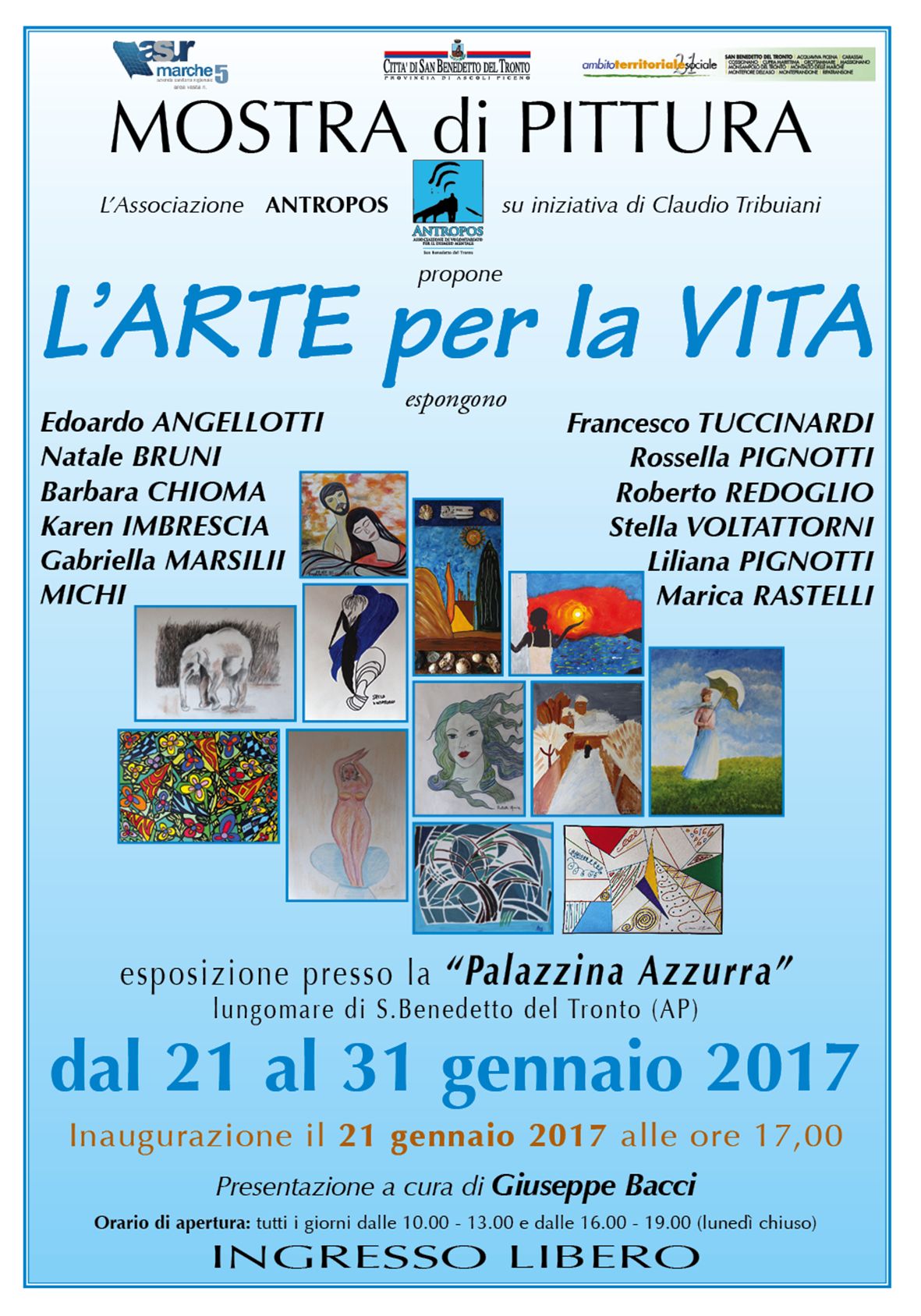 SAN BENEDETTO DEL TRONTO – S’inaugura sabato 21 gennaio alle 17, alla Palazzina Azzurra, la mostra collettiva “Arte per la vita” : in esposizione le opere realizzate dal laboratorio d’arte presso il Centro Diurno di Salute Mentale di San Benedetto del Tronto. Il laboratorio si avvale dell’apporto di affermati artisti del territorio che prestano il loro impegno per favorire il reinserimento sociale delle persone con problematiche di dipendenza o disagio mentale.