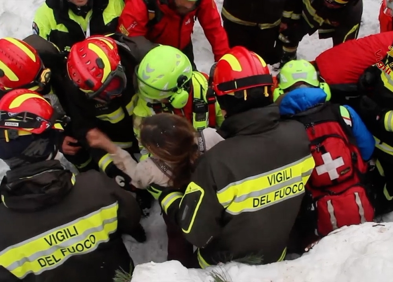 Otto persone tratte in salvo vive dall’hotel Rigopiano. Grande emozione tra i soccorritori che da ore lavorano senza sosta sulla montagna del comune di Farindola per rintracciare tutti gli ospiti della struttura collassata sotto il peso di una slavina che si è staccata dai 2400 metri del monte Sella dopo le abbondati nevicate di questi giorni ed in seguito agli eventi sismici di mercoledì mattina. Alle 12.30 la notizia è rimbalzata dalla tv ai social network nell’euforia generale e nella speranza di ritrovare altre persone salve sotto quel cumulo di macerie e neve. Sei le persone individuate dai vigili del fuoco nella giornata di oggi, due invece quelle tratte in salvo ieri. La prima ad essere estratta viva una donna. Poco dopo un bimbo, venuto fuori dallo scavo tra gli applausi e l’emozione degli uomini in divisa. Immagini straordinarie quelle lanciate via web dai vigili del fuoco. Molto importante il fatto che, in questi momenti, le persone salvate possano dare indicazioni importanti alla task force dell’emergenza per tentare di individuare altri ospiti dell’hotel. La signora è stata trasportata all’ospedale di Pescara a bordo di un elicottero della guardia costiera. In successione tutte le altre persone sono state soccorse e trasferite nelle strutture ospedaliere. C’è attesa sui nomi dei cittadini salvati. Sarebbero sette i marchigiani dispersi nella distruzione dell’hotel. Il grandissimo lavoro di soccorso con l’imponente macchina dell’emergenza sembra abbia avuto un grande aiuto anche dai cani che hanno seguito la colonna mobile. Il primo segnale di vita i soccorritori lo hanno avuto da una fessura dalla quale usciva del fumo. Probabilmente le persone travolte dalla valanga erano riuscite ad accendere un fuoco per riscaldarsi in un punto dell’hotel in prossimità delle sale cucina. Elicotteri della marina militare e altre strutture dell’esercito della Guardia di Finanza della Protezione civile stanno lavorando alacremente da più di 40 ore. Il pensiero va ai familiari che stanno attendendo i nomi delle persone tratte in salvo e a quelli che attendono l’esito delle operazioni di soccorso sperando di poter ricevere una telefonata sulla possibilità che anche i loro cari vengano tratti in salvo.