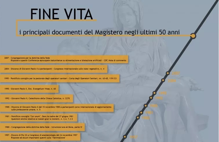 Negli ultimi settant’anni, sono quasi una decina i pronunciamenti principali che, sotto diverse angolature, si sono occupati di questa tematica. In ordine cronologico: Pio XII, Disc. Risposte ad alcuni importanti quesiti sulla “rianimazione”, Congresso di anestesiologia (24-11-1957); Congregazione per la Dottrina della Fede, Istruz. Iura et Bona (1980), parte IV; Pontificio Consiglio “Cor unum”, Dans le cadre. Questioni etiche relative ai malati gravi e morenti (27-6-1981), n. 2.4, 7.2-3; Giovanni Paolo II, Discorso ai partecipanti ad un corso internazionale di aggiornamento sulle preleucemie umane, (15-11-1985), n. 5; Giovanni Paolo II, Catechismo della Chiesa Cattolica (1992), n. 2278; Giovanni Paolo II, Enc. Evangelium Vitae (1995), n. 65; Pontificio Consiglio per la Pastorale degli Operatori Sanitari, Carta degli Operatori Sanitari (1995), nn. 63-65; 119-121; Giovanni Paolo II, Disc. ai partecipanti al Congresso Internazionale sullo stato vegetativo (2004), n. 4; Congregazione per la Dottrina della Fede, Risposte a quesiti della conferenza episcopale statunitense circa l’alimentazione e l’idratazione artificiali, con Nota di commento (2007).