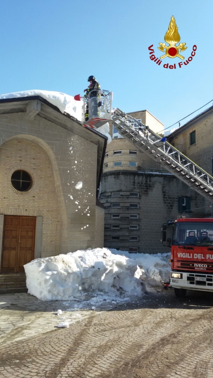 Nella giornata del 25 gennaio una squadra ha operato a Montemonaco, nel complesso di Casa Gioiosa, dove a distanza di qualche giorno dalle abbondanti nevicate, ancora un metro di neve era accumulata sulle coperture degli immobili della zona. Un quantità tale da metter a rischio la stabilità delle strutture.