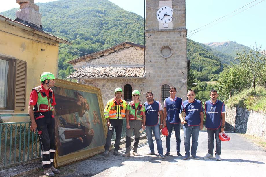 I carabinieri sono in piena attività per il salvataggio dei beni già dal 27 agosto, terminata la prima fase della ricerca dispersi sono subito partite le operazioni per il salvataggio delle opere. Il primo intervento avvenne nella chiesa di Santa Croce nella frazione di Pescara del Tronto con il recupero di una croce astile risalente all’anno 1000, croci che ebbero duplice funzione e significato: il primo naturalmente liturgico, essendo utilizzate per finalità processionali, il secondo, di valenza civile, in quanto simbolo dell’appartenenza ad una comunità. A novembre recuperata una preziosa campanella risalente al 1200 realizzata in concomitanza con la morte di San Francesco. Il 31 gennaio anche nel Fermano un intervento nel comune di Montegiorgio nella chiesa di San Nicolò sono stati messi in sicurezza 116 beni con la stessa composizione delle squadre. Tra le opere più importanti quelle salvate nel Maceratese: un Tiepolo da Camerino nella Chiesa di San Filippo Neri di Camerino. A Ussita alla Pieve nel mese di novembre recuperata una tavola del De Magistris. Il 28 di agosto nella chiesa dell’Assunta di Arquata del Tronto recuperato un crocifisso ligneo policromo del 1200. Un pezzo di straordinaria importanza firmato da due frati frate Benedetto e frate Raniero che ora è nel duomo di Ascoli. Un crocifisso romanico, uno dei pochi nelle Marche a cui gli arquatani tengono molto a tal punto da farne una copia . Una corsa contro il tempo quella di questi mesi per le continue scosse. A Pretare il crocifisso recuperato dai carabinieri e vigili del fuoco con la collaborazione di don Francesco Armandi, il parroco scomparso a gennaio in prima linea dal 24 agosto a supporto della popolazione, è ora in fase di restauro e il fatto di riportarlo alla luce rappresenta per tutti un simbolo di speranza e di rinascita.