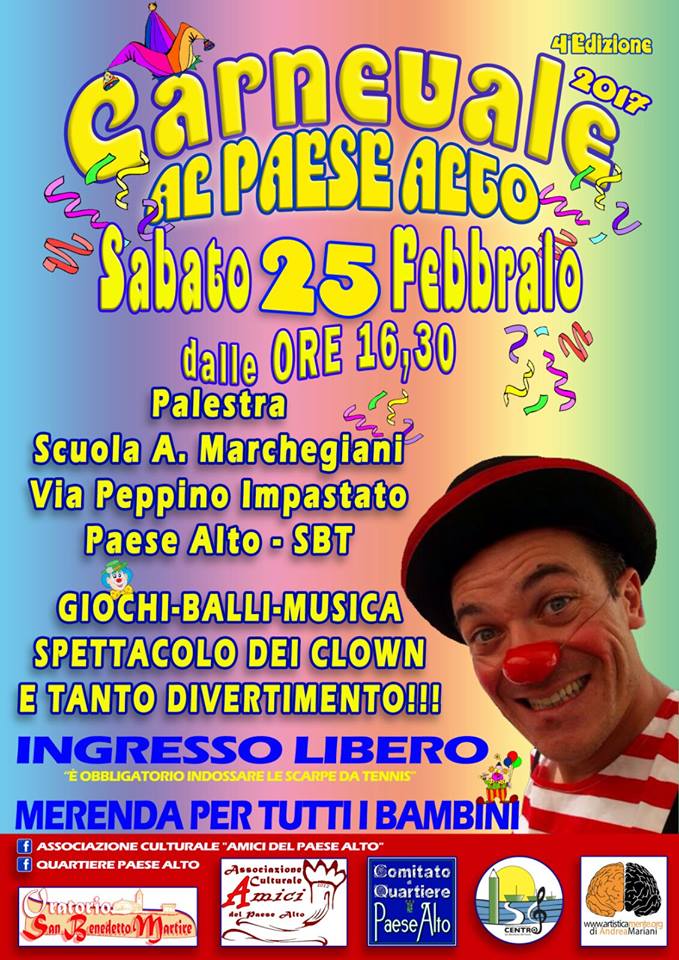 SAN BENEDETTO DEL TRONTO – Grazie al successo degli anni passati, l’Associazione Culturale Amici del Paese Alto e il Comitato di quartiere Paese Alto, in collaborazione con la Parrocchia S. Benedetto Martire, ripropongono la Festa di Carnevale. Anche quest’anno la location sarà la palestra della Scuola Marchegiani, forse meno su