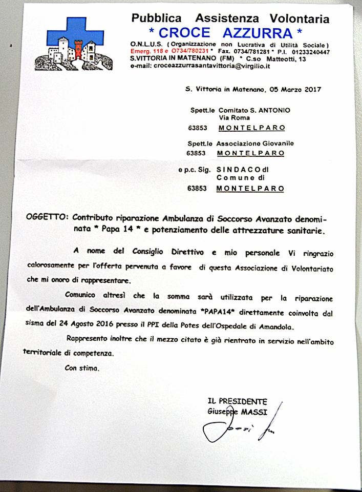 Il contributo sarà destinato a far fronte, almeno in parte, ai costi di riparazione dell’ambulanza danneggiata dai crolli causati dal terremoto del 24 agosto dello scorso anno proprio davanti al pronto soccorso dell’ospedale di Amandola. L’ambulanza infatti era in servizio presso il 118 di quell’ospedale quando, le scosse di quella notte, le fecero piombare addosso parte delle mura dell’edificio sovrastante.