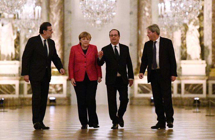 Noi andiamo avanti. Il “padrone di casa”, François Hollande, ha invitato i “colleghi” per un summit tra i quattro maggiori Paesi rimasti nell’Unione, dopo lo sganciamento del Regno Unito (che qui, a Versailles, nessuno rimpiange). Il 9 e 10 marzo è previsto un Consiglio europeo a Bruxelles; il 25 marzo, a Roma, le celebrazioni per il 60° dei Trattati istitutivi della Comunità. Il quartetto vuole lanciare per l’occasione un messaggio inequivocabile: noi andiamo avanti,