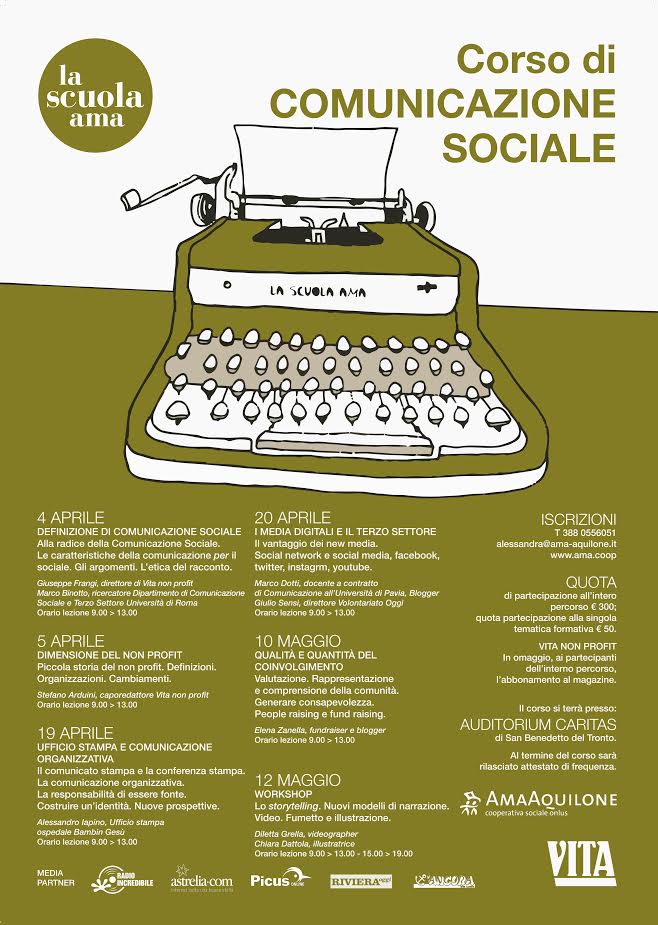 Il corso “Comunicazione Sociale”, che partirà il 4 aprile, è realizzato da “La scuola Ama”, Agenzia di Alta Formazione insieme a “Vita Non profit”, il magazine dedicato al racconto sociale, al volontariato, alla sostenibilità economica e ambientale e al mondo non profit.