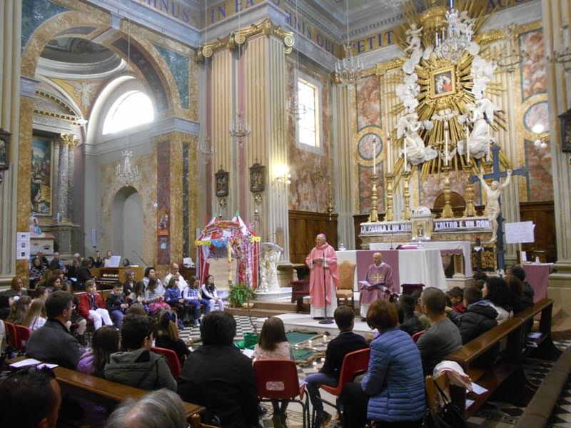 I bambini con i loro genitori e gli educatori Giuliana, Tiziana, Francesco Pio e suor Isabel si sono ritrovati all’oratorio parrocchiale per poi dirigersi in chiesa dove li attendevano il parroco don Alfredo, Sua Eccellenza Mons. Gervasio Gestori e padre Claudio.