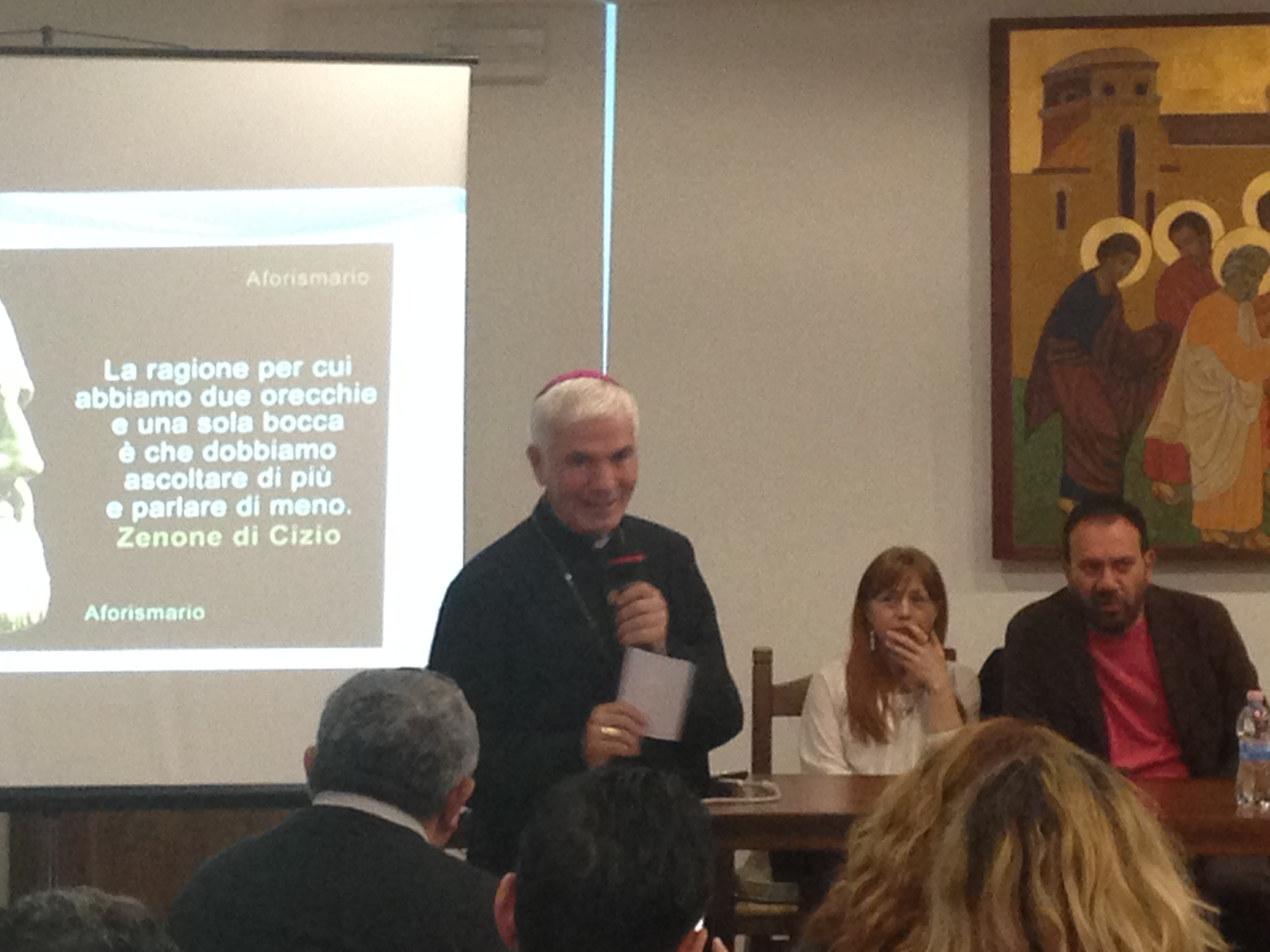 La conclusione spetta a Sua Eccellenza Monsignor Giovanni D’Ercole, vescovo di Ascoli Piceno, che introduce una prima parte dell’omelia di cui discorrerà nella successiva celebrazione che avrà luogo nella chiesa del Monastero. Nel suo intervento il Vescovo afferma: “E’ importante non tanto comunicare ma farsi comprendere perché la stessa cosa viene percepita in molte maniere diverse. Il lavoro difficile della comunicazione è proprio farsi capire. Bisogna essere umili nel comprendere che per quanto sforzo si faccia, ci sarà sempre qualcuno che non capirà. In questa era di marketing sarà sempre più difficile farsi capire e diventerà una vera missione soprattutto per coloro che sono al servizio della verità che oggi diventa sempre più difficile da capire e da comunicare”.