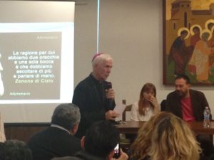 Particolare attenzione ha suscitato l’intervento di Maurizio Di Schino, segretario nazionale dell’UCSI (Unione Cattolica Stampa Italiana) a Roma, inviato speciale di TV 2000 che ha raccontato la sua esperienza di inviato da una parte e responsabile dall’altra parte e ha messo in evidenza l’invito che fa ai colleghi di riflettere sulla propria missione assieme all’elemento deontologico che è proprio dell’ordine dei giornalisti. “Come UCSI noi abbiamo il compito di formarci e offrire opportunità di formazione, tutto questo come parte della chiesa. Ogni volta che scriviamo dobbiamo sempre chiederci quale parola utilizzare in quel momento, ogni parola è una storia, ispirata dal contesto. Bisogna entrare in empatia e stabilire un rapporto e un dialogo prima ancora di piazzare telecamere e microfoni. In queste circostanze la realtà va rispettata e ascoltata, bisogna porsi in silenzio ancor prima di parlare e di scrivere”.