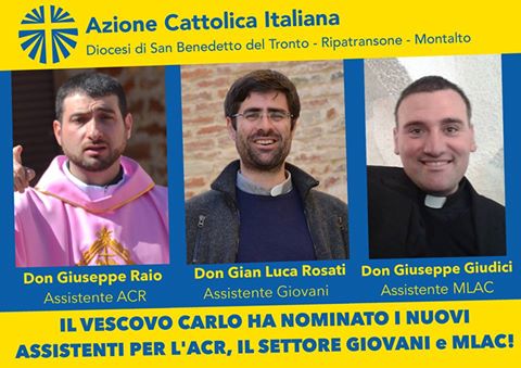 DIOCESI – Con grande gioia e gratitudine, l’Azione Cattolica Italiana della diocesi di San Benedetto del Tronto, Ripatransone e Montalto accoglie la nomina di Don Giuseppe Raio come assistente ecclesiastico per l’ACR, Don Gian Luca Rosati come assistente ecclesiastico per il Settore Giovani e Don Giuseppe Giudici come assistente ecclesiastico per il Movimento Lavoratori di AC! A tutti l’Azione Cattolica assicura la preghiera e il sostegno per il cammino bello e pieno che stanno per intraprendere e affida il loro prezioso “SI” alla nostra associazione a Maria. Un sentito ringraziamento va a Don Gianluca Rosati per il servizio che ha svolto negli ultimi anni con i ragazzi dell’ACR e Don Roberto Melone per il servizio con i giovani! Viva l’AC e viva i nostri assistenti!