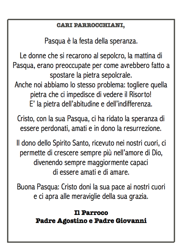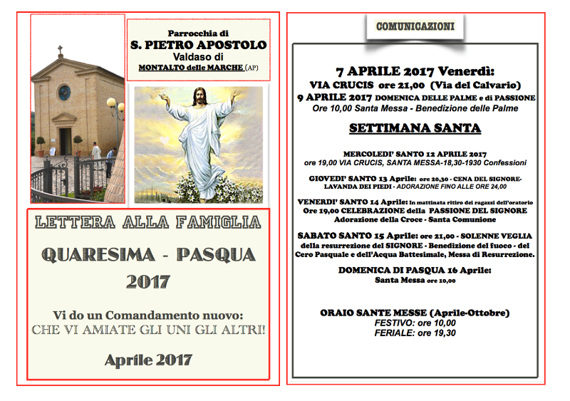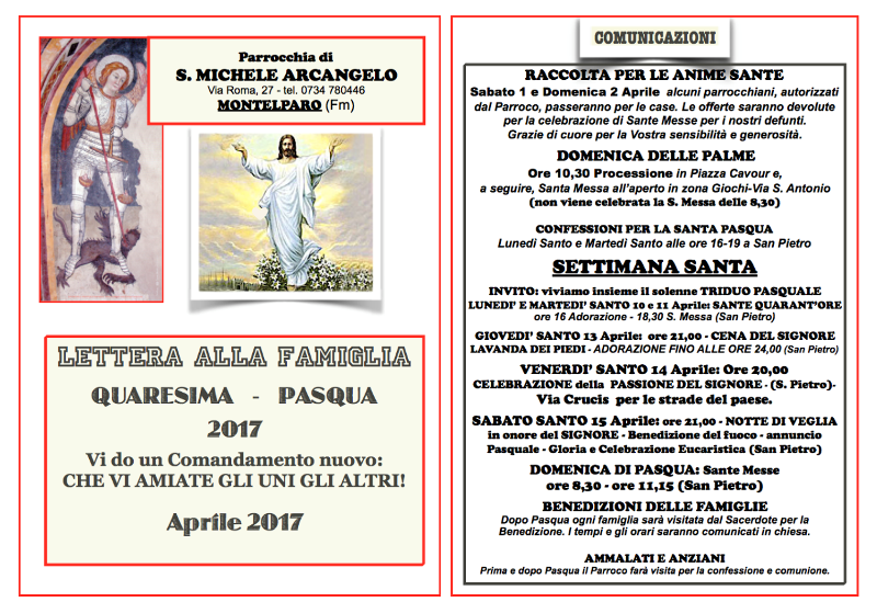 MONTELPARO – Le comunità parrocchiali di Montelparo (San Michele Arcangelo) e di Valdaso di Montalto delle Marche (San Pietro Apostolo), nelle quali svolge la funzione di Parroco Padre Agostino Maiolini (coadiuvato dal Vice/Parroco Padre Giovanni Mazzoni), hanno comunicato alle famiglie gli appuntamenti Pasquali distribuendo apposite locandine dove sono citate tutte le cerimonie religiose che si terranno in questo periodo.