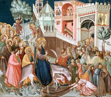 E’ un ingresso trionfale quello di Gesù a Gerusalemme: la folla acclama a gran voce il nuovo re e nuovo Davide che entra nella città santa per la liberazione e la salvezza del popolo.
