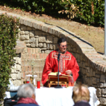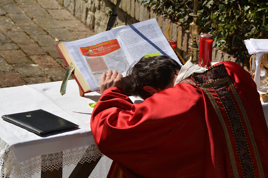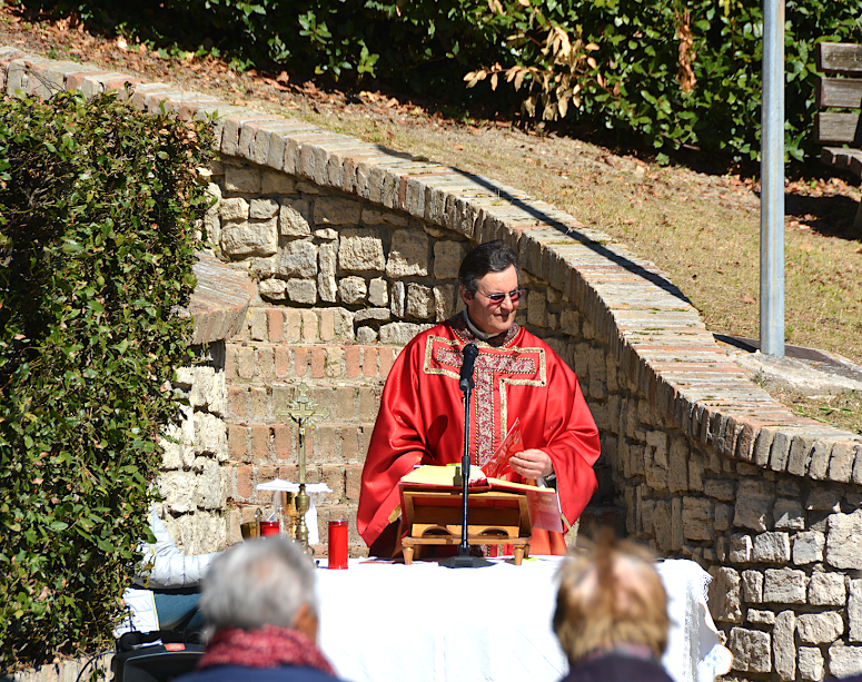 Considerato che tutte le chiese del paese sono state, si, messe in sicurezza, ma che nessuna di loro è attualmente agibile (la minuscola Chiesa dei SS. Pietro e Silvestro sarebbe stata insufficiente a ospitare tutti i fedeli!) il Priore Padre Agostino Maiolini ha avuto l’idea luminosa di celebrare (ed è stata la prima volta!) l’avvenimento all’aperto.