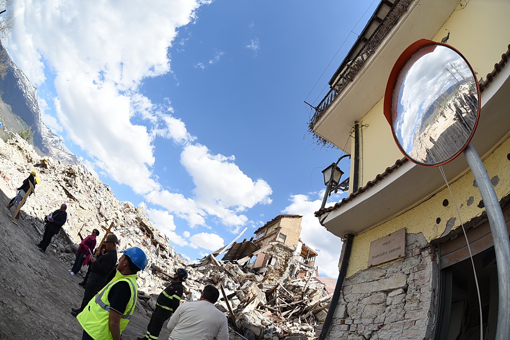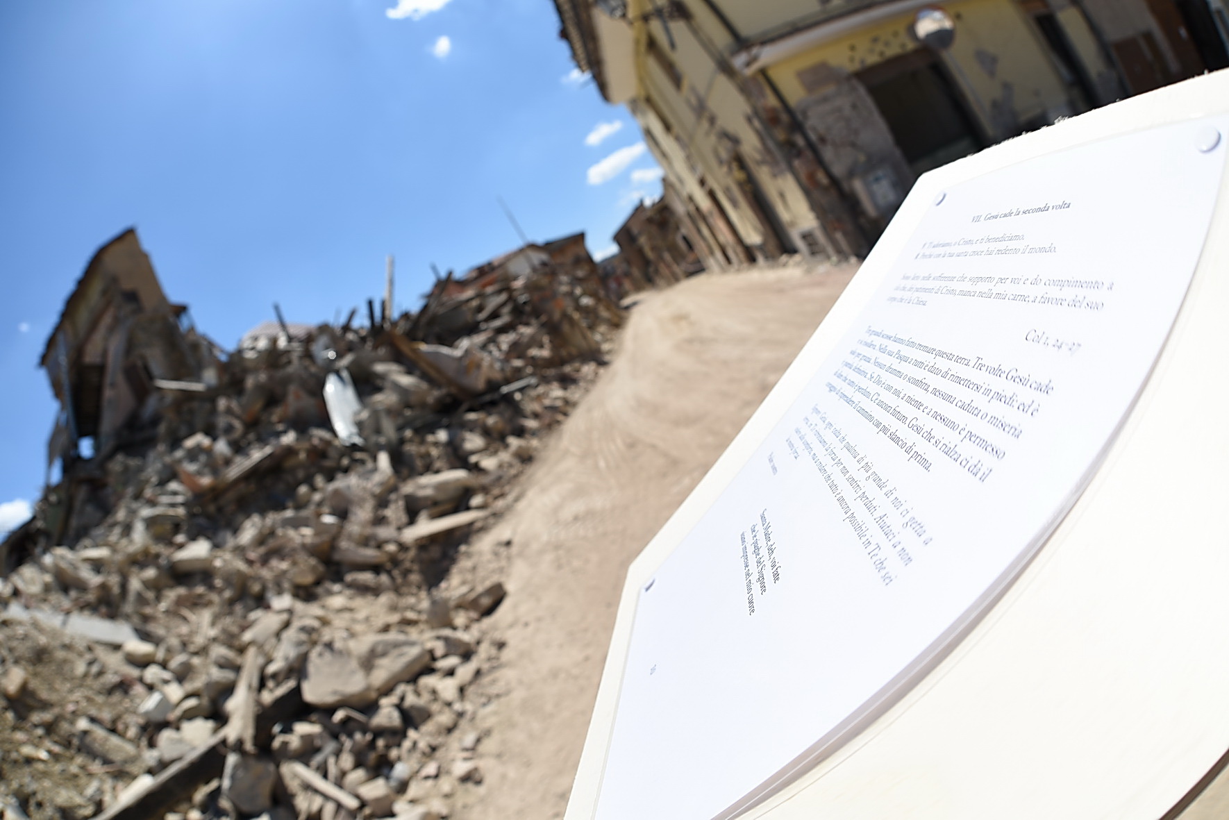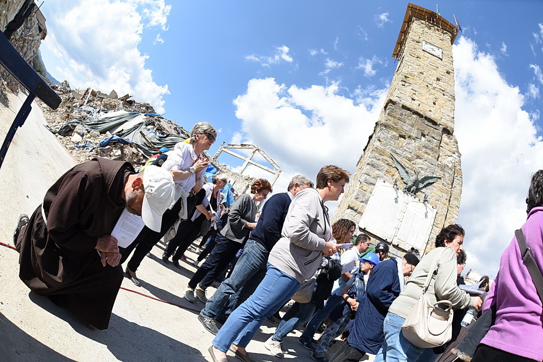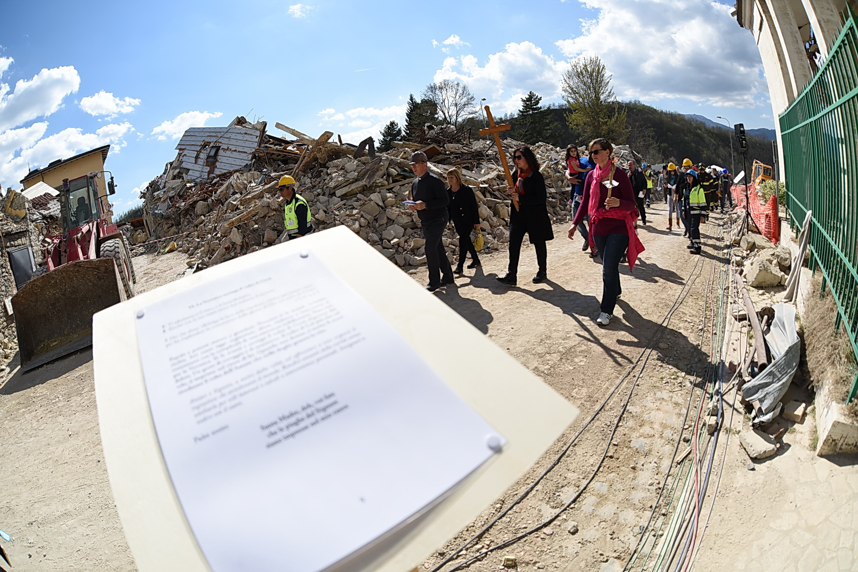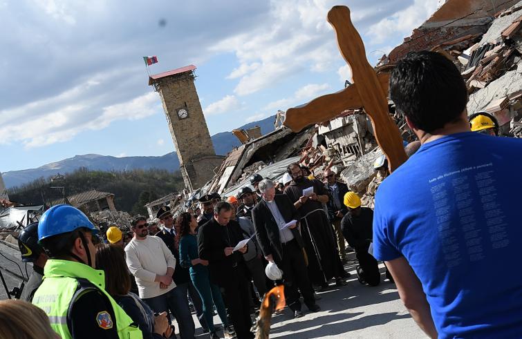“Nessun male viene da Dio! Dio non vuole il male dei suoi figli, ma lo condivide, solidale con tutte le vittime di ogni ingiustizia”. È cominciata con queste parole la Via Crucis nella zona Rossa di Amatrice: 14 stazioni, comprese tra l’ospedale “Francesco Grifoni”, gravemente lesionato dal sisma del 24 agosto e in via di demolizione, e la Chiesa simbolo di sant’Agostino, di cui resta in piedi solo la parete destra puntellata da un castello di tubi innocenti. Poco più di mille metri per ripercorrere, nel giorno di Venerdì Santo, la passione di questa terra e della sua gente ferita, iniziata il 24 agosto e di cui oggi è impossibile vederne la fine. A portare la Croce, per tutto il tragitto, una famiglia terremotata, tra letture, meditazioni, preghiere e canti. Subito dietro un centinaio di amatriciani, composti, dignitosi nella loro sofferenza, e in mezzo a loro il vescovo di Rieti, mons. Domenico Pompili, mons. Paul Tighe, segretario aggiunto del Pontificio Consiglio della cultura, e il Commissario straordinario per la ricostruzione Vasco Errani. A fare da sfondo il silenzio delle macerie che hanno sepolto persone e luoghi, un tempo familiari, davanti ai quali la comunità dei fedeli si è fermata per meditare le stazioni. Davanti al benzinaio, al supermercato, alla casa delle suore, all’Hotel Roma, alla Torre civica, al ‘Palazzo rosso’ e così via fino a sant’Agostino.