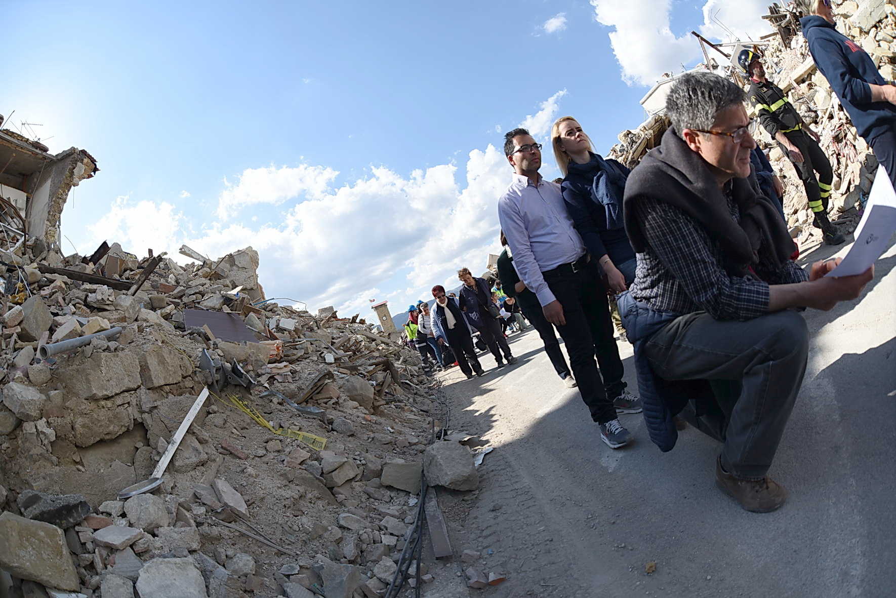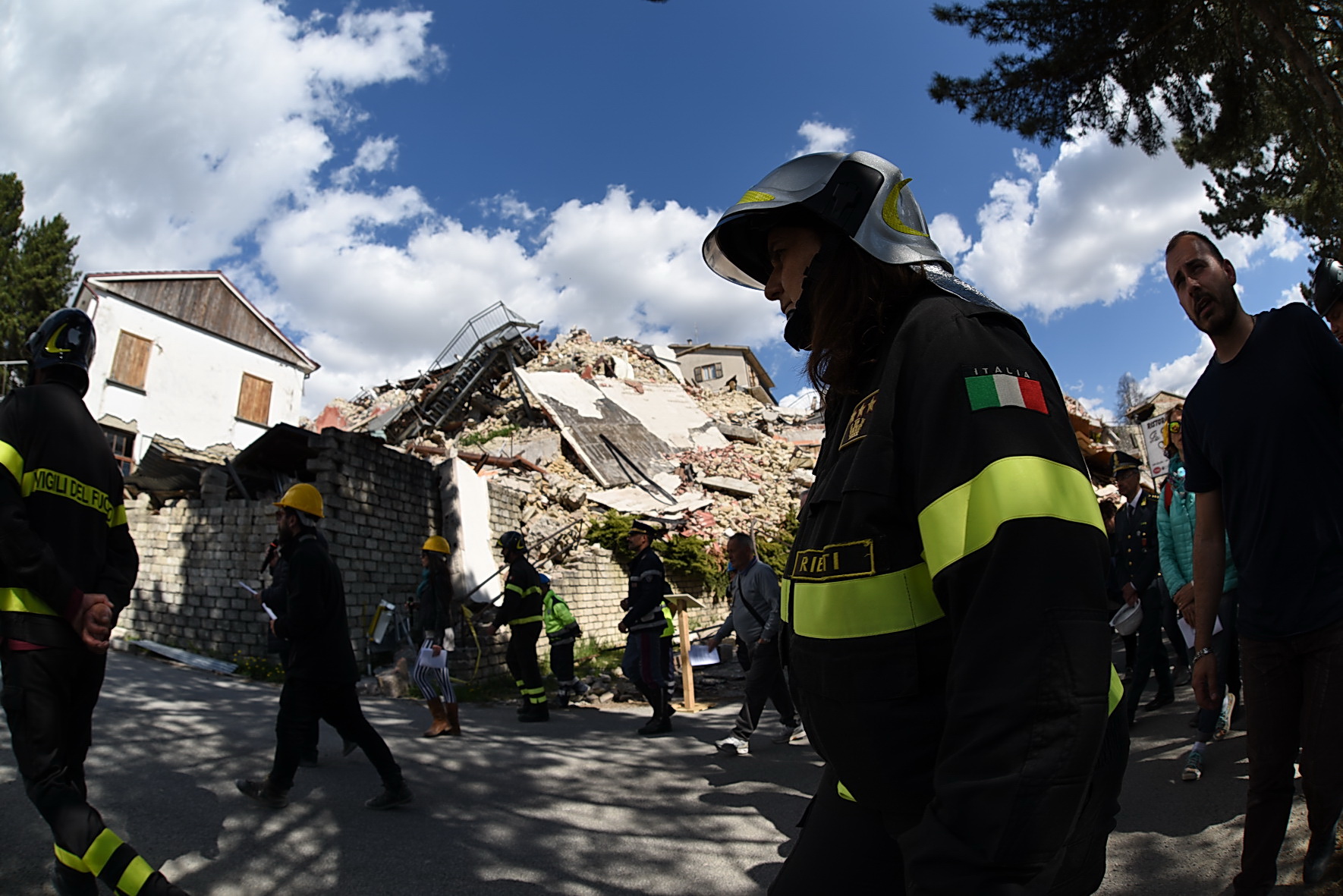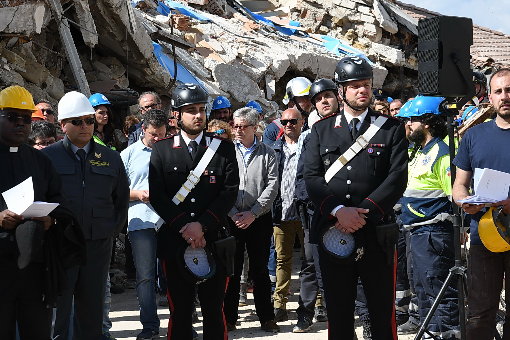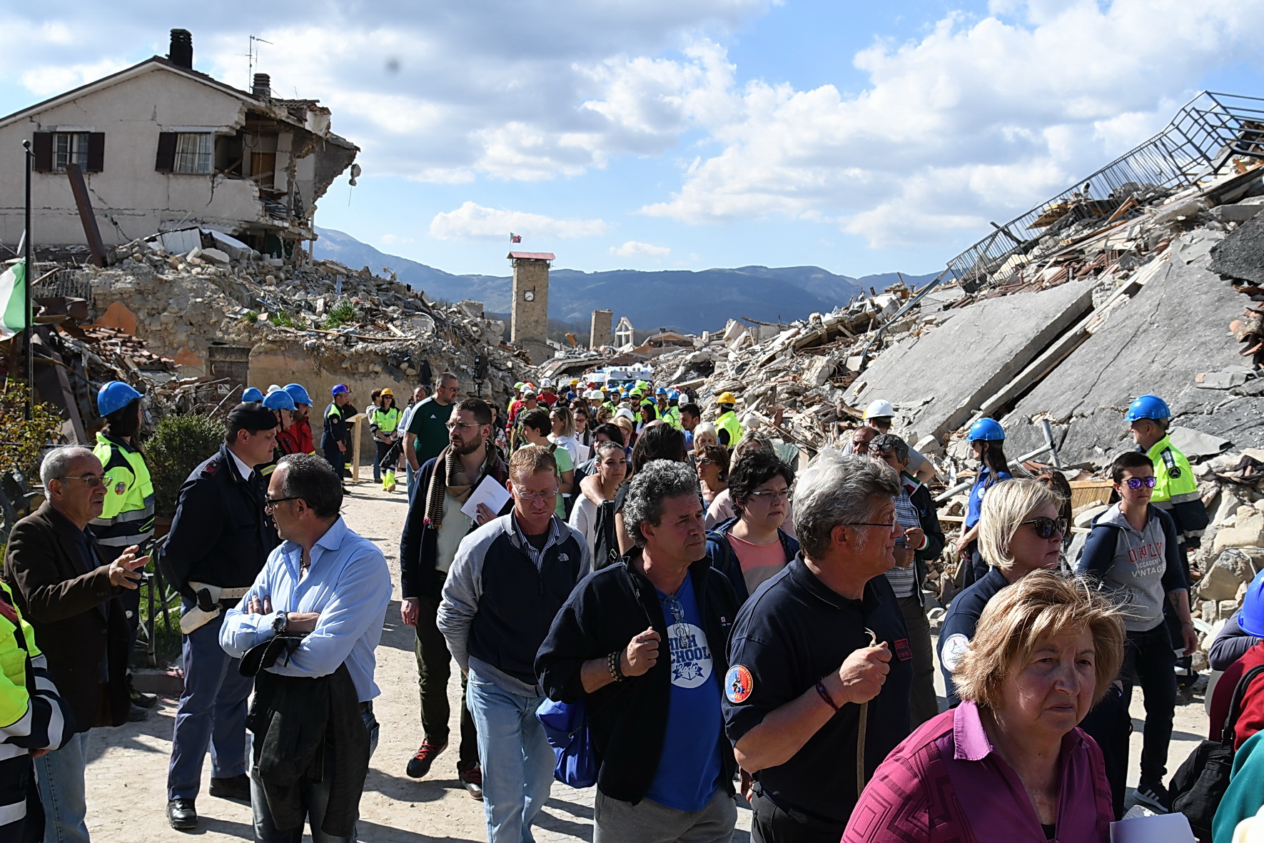“Nessun male viene da Dio! Dio non vuole il male dei suoi figli, ma lo condivide, solidale con tutte le vittime di ogni ingiustizia”. È cominciata con queste parole la Via Crucis nella zona Rossa di Amatrice: 14 stazioni, comprese tra l’ospedale “Francesco Grifoni”, gravemente lesionato dal sisma del 24 agosto e in via di demolizione, e la Chiesa simbolo di sant’Agostino, di cui resta in piedi solo la parete destra puntellata da un castello di tubi innocenti. Poco più di mille metri per ripercorrere, nel giorno di Venerdì Santo, la passione di questa terra e della sua gente ferita, iniziata il 24 agosto e di cui oggi è impossibile vederne la fine. A portare la Croce, per tutto il tragitto, una famiglia terremotata, tra letture, meditazioni, preghiere e canti. Subito dietro un centinaio di amatriciani, composti, dignitosi nella loro sofferenza, e in mezzo a loro il vescovo di Rieti, mons. Domenico Pompili, mons. Paul Tighe, segretario aggiunto del Pontificio Consiglio della cultura, e il Commissario straordinario per la ricostruzione Vasco Errani. A fare da sfondo il silenzio delle macerie che hanno sepolto persone e luoghi, un tempo familiari, davanti ai quali la comunità dei fedeli si è fermata per meditare le stazioni. Davanti al benzinaio, al supermercato, alla casa delle suore, all’Hotel Roma, alla Torre civica, al ‘Palazzo rosso’ e così via fino a sant’Agostino.