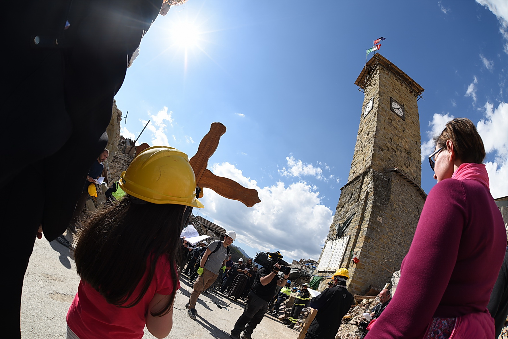 Noi ne siamo testimoni”. Testimoni anche di gesti coraggio, come quello della Veronica che asciuga il volto di Gesù (VI Stazione) quando davanti a Lui sofferente “nessuno si fa avanti, nessuno rischia. Ieri come oggi: ingiustizie, abusi, violenze e corruzioni si consumano con la complicità di una omertosa indifferenza”. La Croce di Amatrice prosegue verso il Calvario e si avvicina ad uno dei suoi simboli, la Torre civica. Gesù cade la seconda volta (VII stazione), poi la terza (IX), in mezzo l’incontro con le donne di Gerusalemme che piangono su di lui (VIII).
