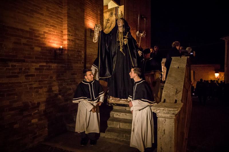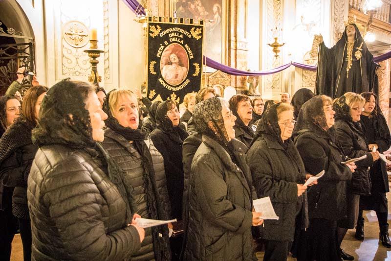 Più di 300 le persone del paese coinvolte in vari ruoli, poiché se la bara è il centro di tutta la processione non vanno dimenticate le altre componenti:la Croce ed i simboli della passione, le 7 parole dette da Gesù e ricamate su gonfaloni rossi, le vergini vestite di bianco rappresentate dalle bambine della parrocchia, le pie donne vestite di nero, le ragazze con le 7 spade, la banda musicale composta in gran parte dai ragazzi dell’ISC di Monteprandone, le autorità religiose e civili partire dai Carabinieri in alta uniforme, la statua di San Giovanni e quella della Madonna addolorata portate in spalla da vari portatori.