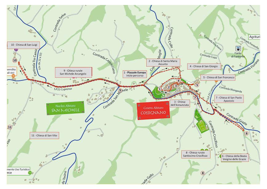 La camminata prevede un percorso lungo un circuito con tappe in tutti luoghi di culto, dando la possibilità ai partecipanti di ammirare le bellezze del territorio e di conoscere anche le chiese rurali, con una visita esterna arricchita con brevi informazioni degli undici luoghi individuati nell’itinerario, che in sintesi vengono riportate: