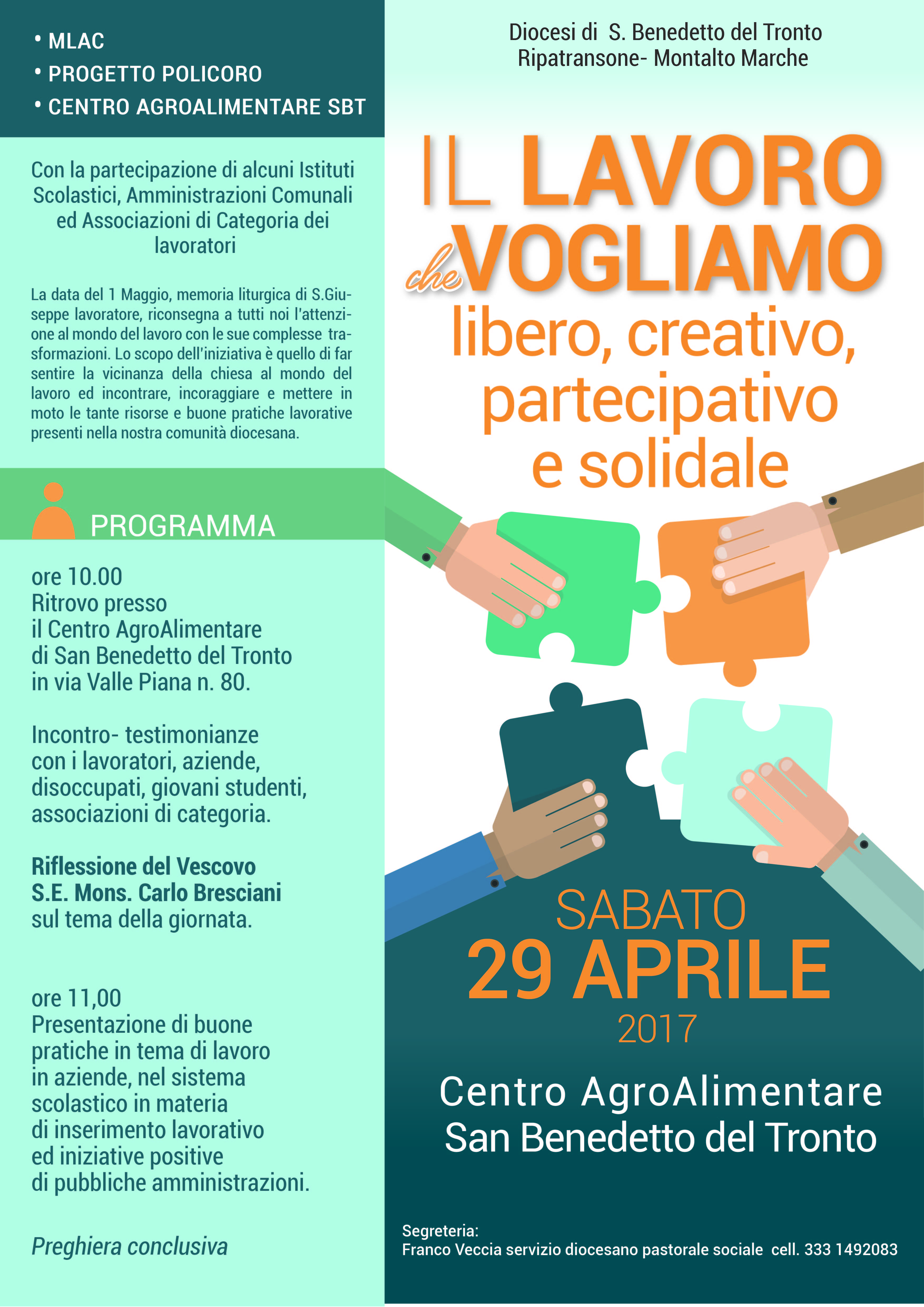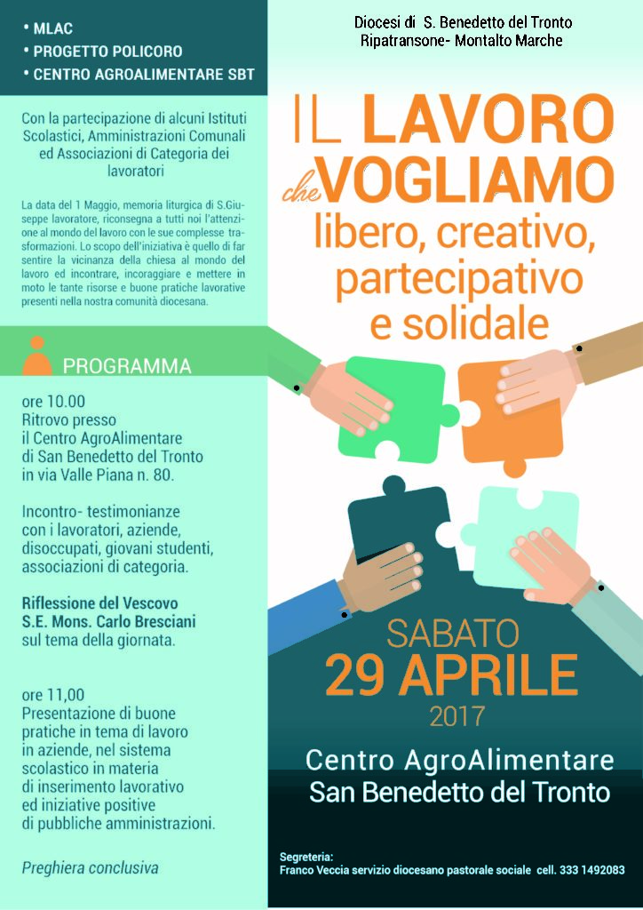 Anche il nostro Vescovo S.E. Mons. Carlo Bresciani, con un invito nel quale ricorda le parole di Papa Francesco sul lavoro “libero, creativo, partecipativo e solidale” nel quale “l’essere umano esprime e accresce la dignità della propria vita” (Evangelii Gaudium n. 192), ci incoraggia a “mettere insieme le tante energie e creatività che ancora oggi ci sono nel nostro territorio: dobbiamo aver fiducia e stimolare la collaborazione di tutti, perché un lavoro dignitoso per tutti è fondamento di ogni comunità e permette l’integrazione pacifica delle nuove culture che si affacciano all’orizzonte della nostra società”.