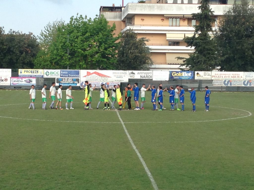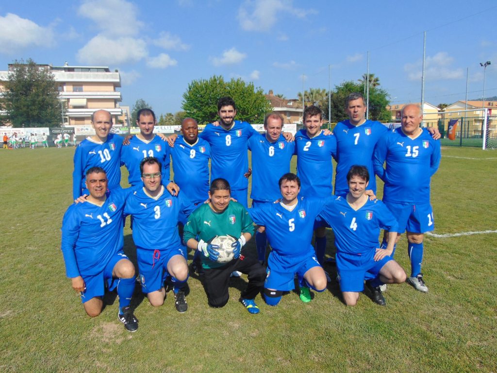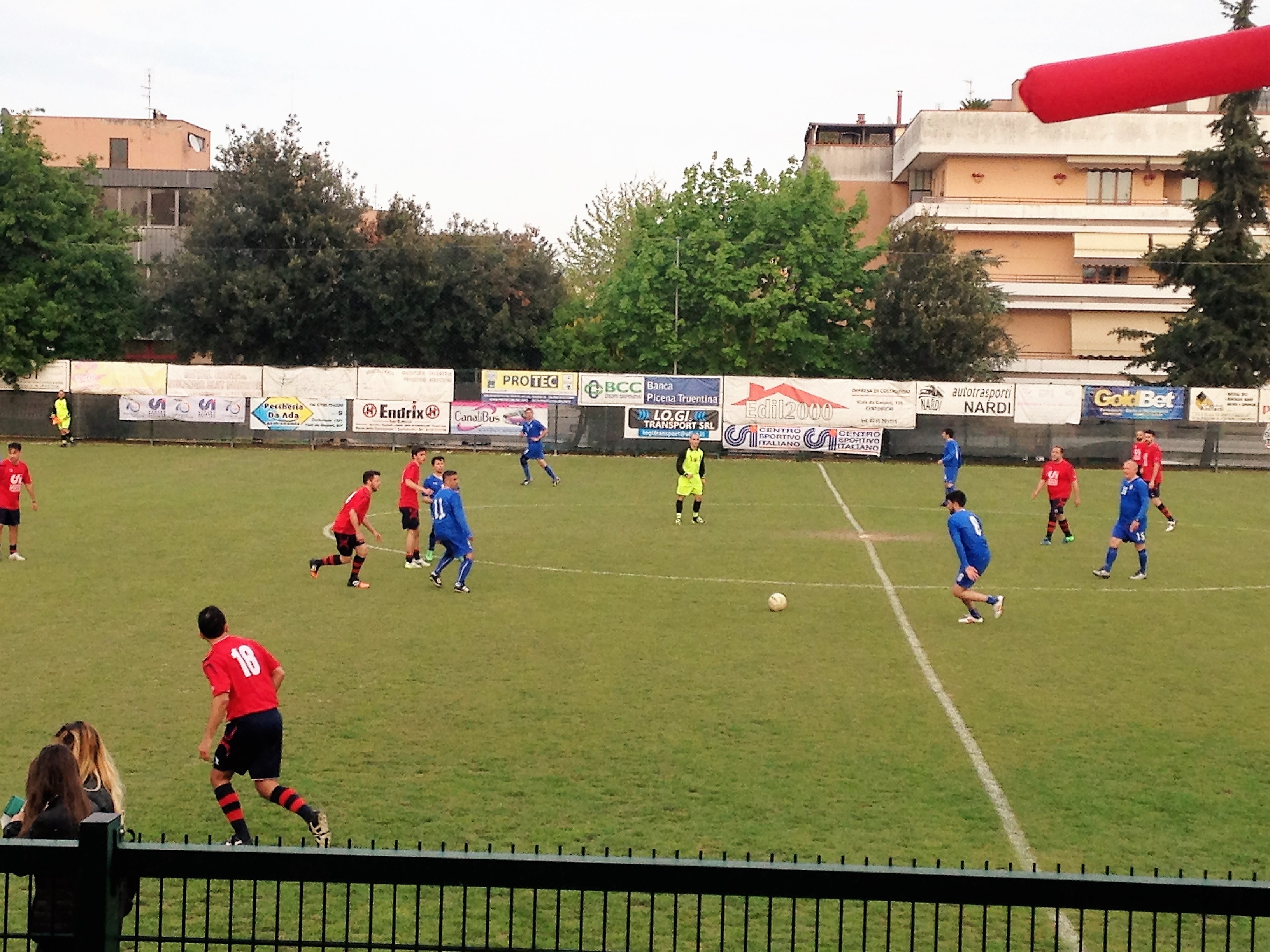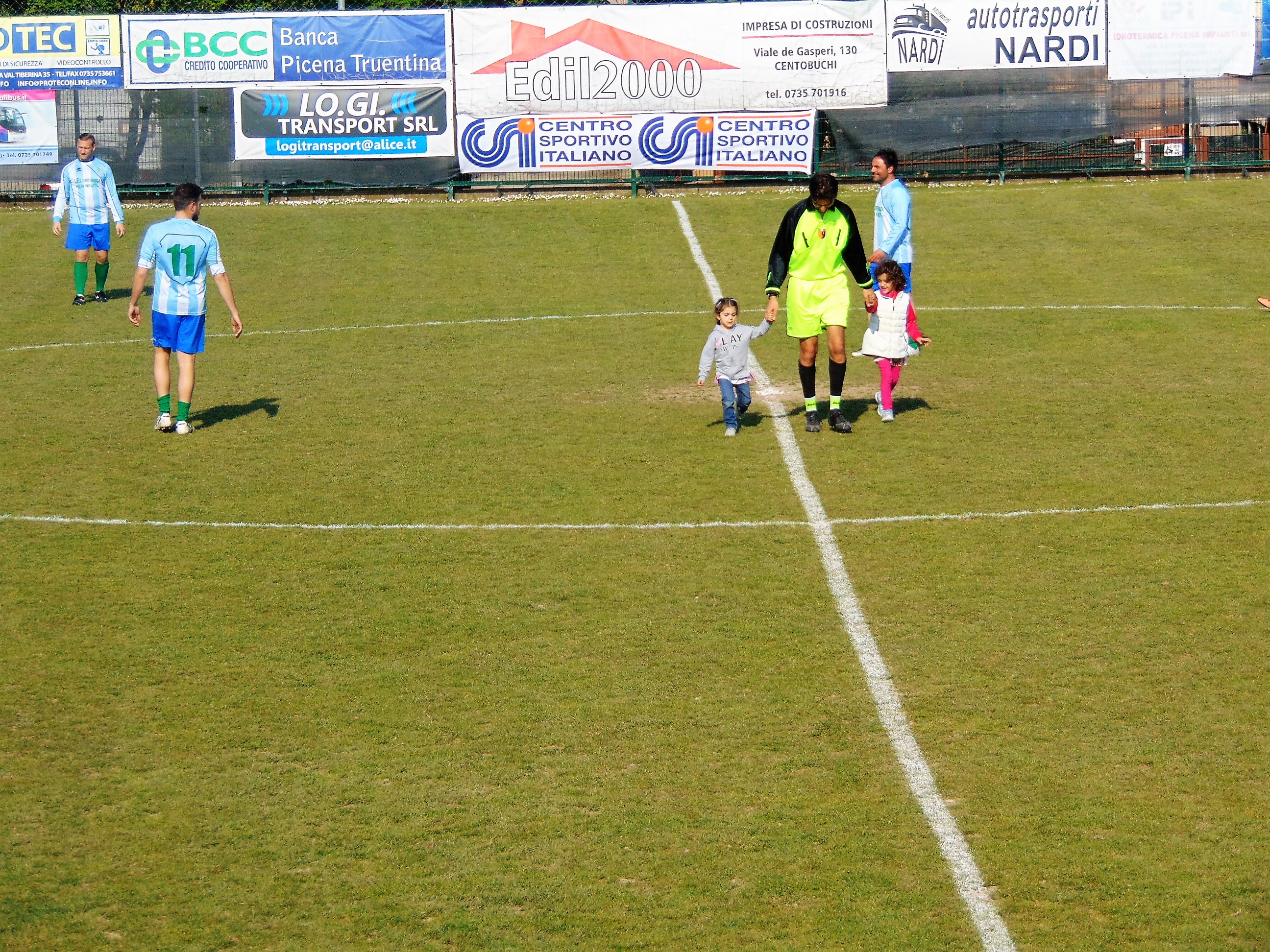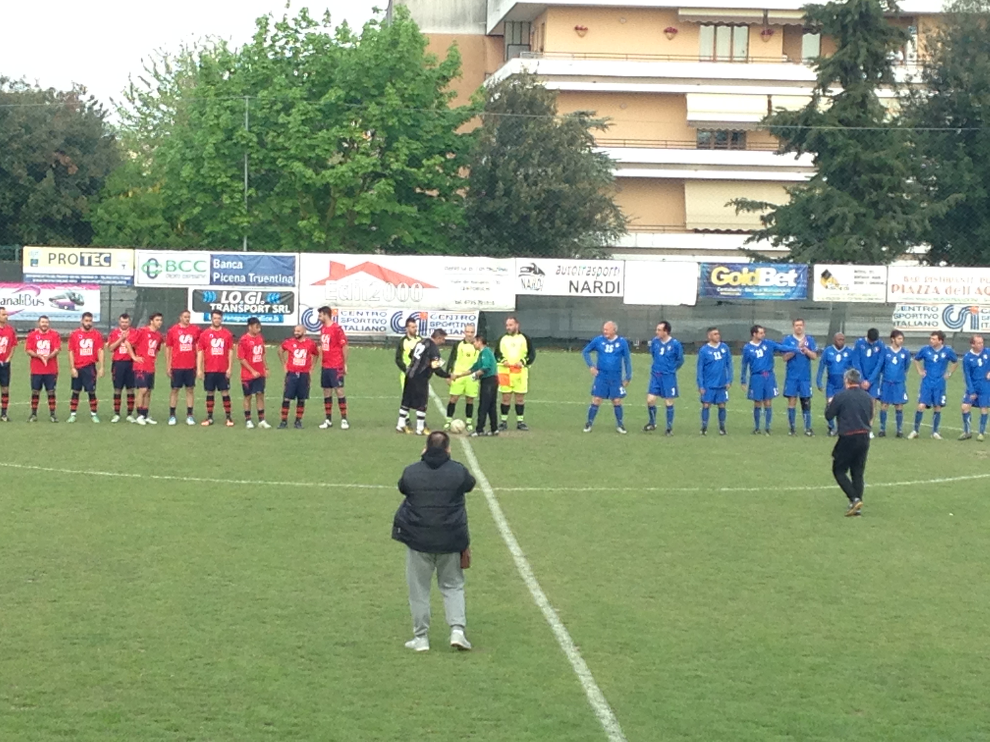 Segue l’inno d’Italia. Le prime due squadre che si sono affrontate nei primi 25 minuti di partita sono la selezione ANCI formata da Sindaci e Amministratori e la Rappresentativa volontari. A dare il calcio d’inizio due bimbe facenti parte dei terremotati accompagnate dall’arbitro e la partita prende il via. Già dalla prima azione la Rappresentativa amministratori mostra di essere tenace, ma la Rappresentativa volontari risponde colpo su colpo alle pressioni. Il primo vero pericolo corso dai volontari è un tiro di sinistro da parte del numero 8 della squadra degli amministratori. Al secondo tentativo per i biancocelesti, la palla rischia di finire in rete; i volontari tirano un sospiro di sollievo. Passano subito al contrattacco i volontari rossoblu ma la prodezza del portiere dell’ANCI, il Sindaco di Monteprandone, Stefano Stracci, mette fine all’azione. Entra in campo il Sindaco di San Benedetto, Pasqualino Piunti. Prima fase di pressione per gli amministratori: i volontari prendono le misure. Subito dopo il secondo cambio della partita, una galoppata del numero 7 dei biancocelesti, Valerio Pignotti, mette a segno il vantaggio. I volontari ora pressano su tutto il fronte in attacco ma vedono sfumare le occasioni per le “prodezze” del Sindaco Stracci. La sfida termina con il raddoppio degli amministratori sempre da parte di Valerio Pignotti, dopo un passaggio smarcante del sindaco Piunti. Il numero 7, per il momento, si aggiudica la nomina di “match winner” della partita.