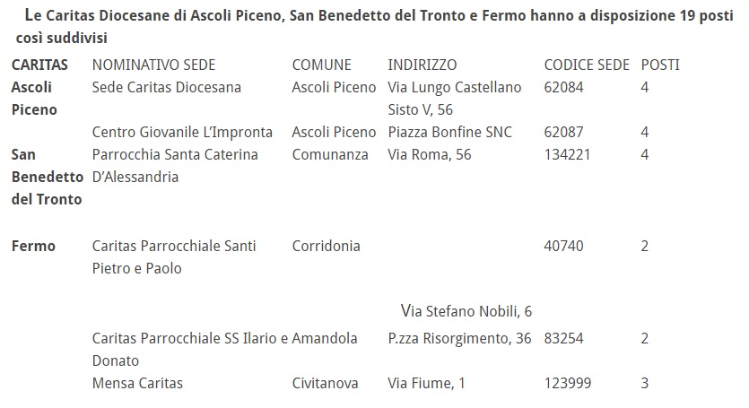 MARCHE – Al via il bando per i volontari del servizio civile che opereranno nelle aree terremotate. Alcune delle Caritas diocesane delle Marche hanno richiesto giovani per le zone terremotate o per le zone della costa che accolgono gli sfollati. La diocesi di Ascoli Piceno, Fermo e San Benedetto del Tronto.