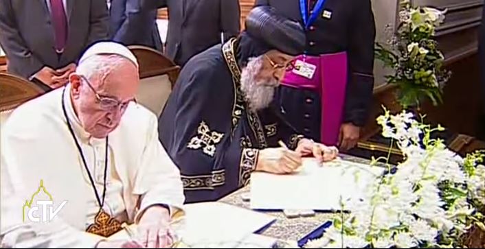 Testo integrale della dichiarazione congiunta firmata al Cairo ieri, 28 aprile 2017, da Papa Francesco e da Tawadros II, Papa di Alessandria e Patriarca della Sede di San Marco.