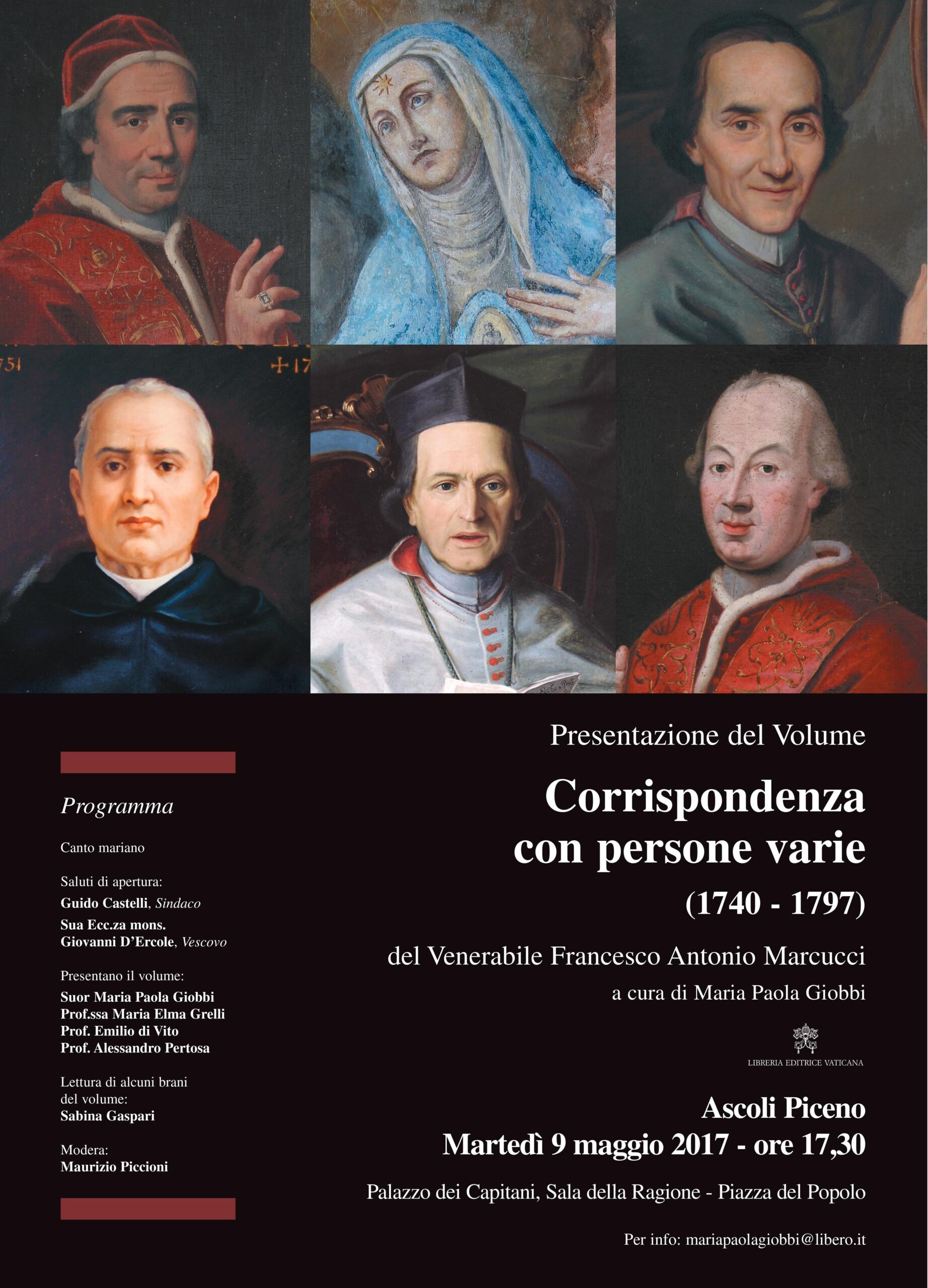 Martedì 9 maggio, alle ore 17.30 presso la Sala della Ragione del Palazzo dei Capitani di Ascoli Piceno si terrà la cerimonia di presentazione del Volume “Corrispondenza con persone varie”, del Venerabile Francesco Antonio Marcucci, a cura di Suor Maria Paola Giobbi stampato presso le Grafiche D’Auria ed edito dalla LEV (Libreria Editrice Vaticana).