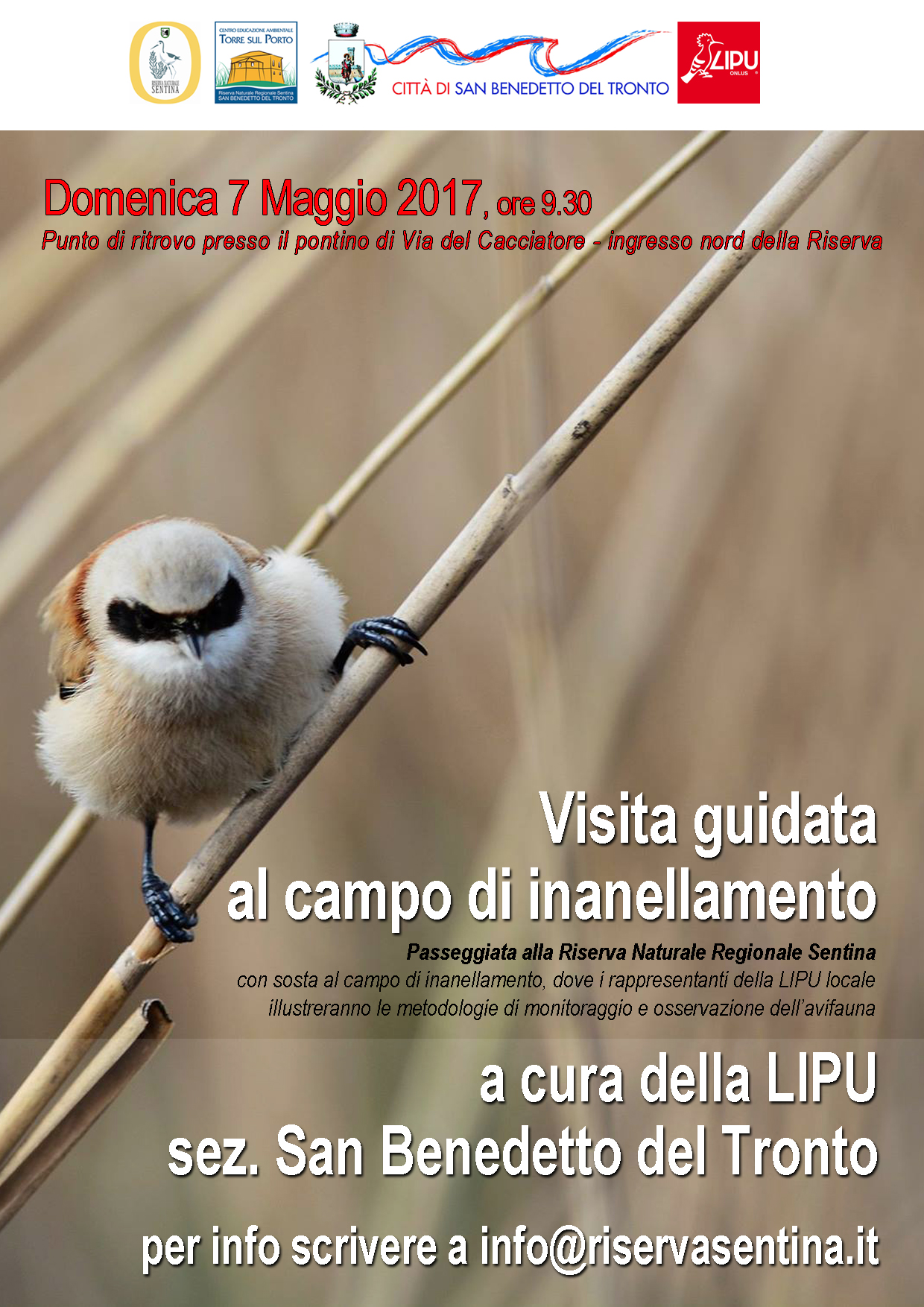 SAN BENEDETTO DEL TRONTO – In queste settimane di intenso passaggio migratorio dell’avifauna, la Riserva Sentina è il luogo ideale per praticare il birdwatching. Domenica 7 Maggio avrà luogo una visita guidata nell’area protetta, proprio sul filo conduttore dell’avifauna. In particolare si dedicherà ampio spazio ad assistere alle procedure di monitoraggio dell’avifauna tramite la tecnica dell’inanellamento, in corso di svogimendo da parte della LIPU, delegazione di San Benedetto del Tronto. Gli esperti ornitologi spiegheranno ai presenti curiosità, dettagli scientifici e guideranno al riconoscimento di alcune specie.