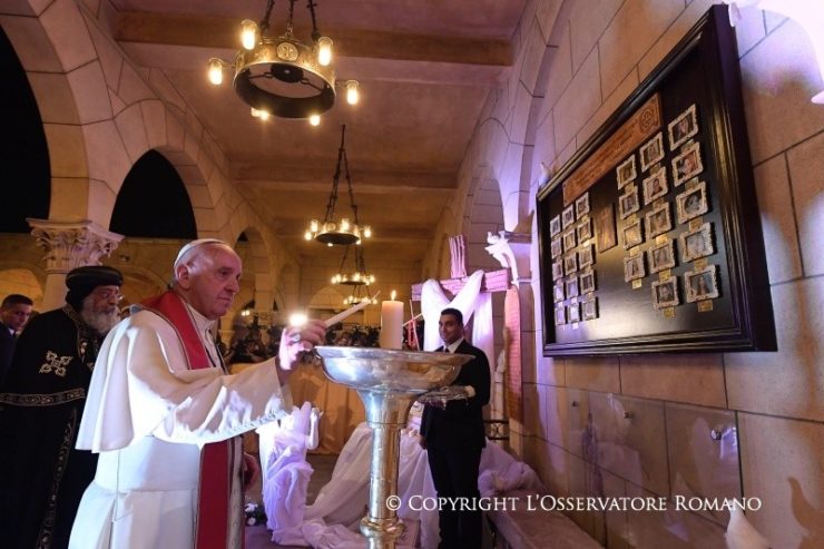 Durante la sua recente visita di cortesia al patriarca copto-ortodosso Tawadros II, papa Francesco ha reso omaggio alle vittime degli ultimi attentati contro i cristiani copti in Egitto, pregando la sera di venerdì 28 aprile in silenzio davanti ad un muro ancora macchiato di sangue della chiesa, conosciuto ormai come il “Muro dei martiri”.