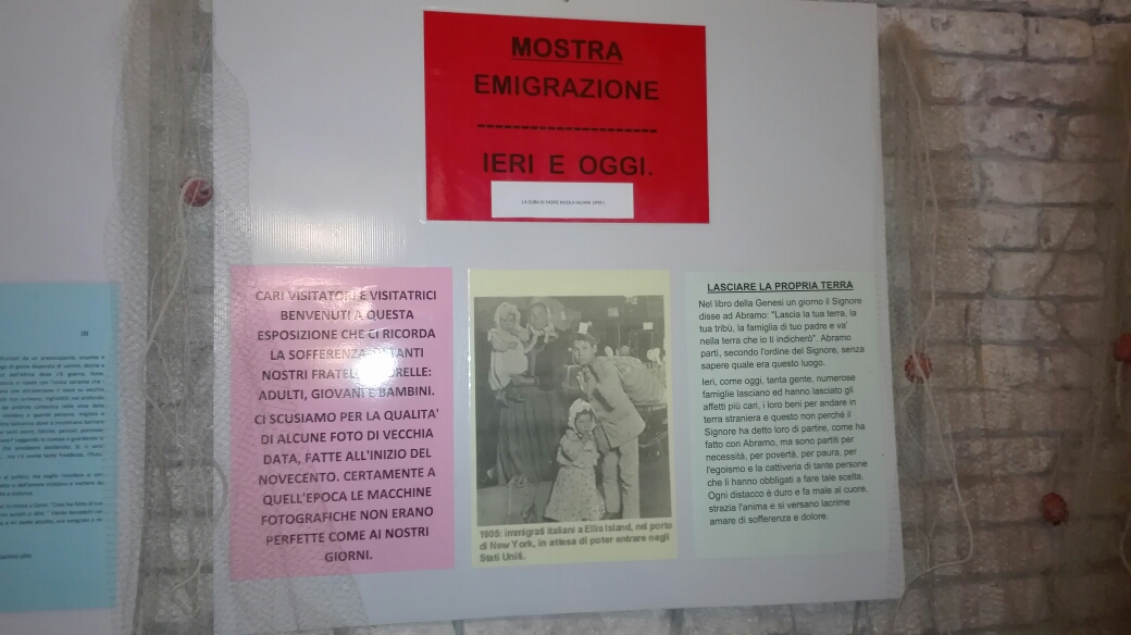 MONTEPRANDONE – “Un Popolo in Cammino ….Ieri e oggi” è il titolo dell’esposizione fotografica di Padre Nicola Iachini, inaugurata sabato 6 Maggio nel Chiostro del Convento di San Giacomo della Marca di Monteprandone. Le opere rimarranno esposte fino al 18 Giugno e si potranno visitare tutti i giorni dalle 9.00 alle 20.30 . Si tratta di un percorso fotografico dove viene raccontato ed affrontato un tema di scottante attualità che riguarda il passato ed il presente : il fenomeno dell’emigrazione. Quando vengono a mancare le condizioni necessarie al pieno compimento dei desideri dell’uomo, questo è spinto a cercare un luogo diverso da quello di origine “dove aver migliore fortuna”. Le motivazioni, possono essere di vari tipi: o di natura politica , o economica, o di persecuzione, ma la separazione dalla terra d’origine è sempre sentita come una frattura nella vita personale e familiare. Sono sempre esistiti due tipi di emigrazione : quella temporanea e quella permanente . Nella prima l’emigrato trova lavoro ,mette da parte i propri risparmi e, dopo qualche anno, torna alla sua casa; nella permanente invece, resta nel luogo dove si è stabilito. L’Italia è stata ed è una Nazione di emigranti; secondo recenti statistiche, gli italiani all’estero sarebbero attualmente 4.500.000 . Gli oriundi (italiani e figli che hanno preso la nazionalità del paese in cui vivono), secondo la Farnesina sono 58.500.000. Presenti all’inaugurazione il Sindaco Stefano Stracci che ha portato anche il saluto della vice presidente della Regione Marche, Casini che, per motivi istituzionali non è potuta venire ma condivide lo spirito e le finalità di questa mostra , il presidente della Pro-Loco Bruno Giobbi , il Consigliere Provinciale Pacifico Malavolta . È stato affrontato di nuovo anche il tema post terremoto che ha colpito anche la Parrocchia S. Nicolò di Bari , “La chiesa è rientrata tra le prime 13 che verranno ristrutturate;è stato concesso un plafon di 300.000 euro per restaurare anche quella colleggiata del nostro comune – ha dichiarato il sindaco. Ringrazio Padre Nicola; non è la sua prima mostra che allestisce intorno a un tema particolarmente a lui caro. Per anni siamo stati terra di emigrazione, oggi siamo terra di immigrazione. Nonostante ciò bisogna rimanere “umani” “. Al termine , prima di un breve rinfresco , ha preso parola Padre Nicola : “Ringrazio tutti della vostra presenza. Avrei voluto dire molto ma penso che l’essenziale si trovi in questo contesto. Ho terminato la mostra a luglio 2016 ed esposta nel Palazzo dei Capitani (Piazza del Popolo ).Purtroppo le ultime statistiche non sono state aggiornate”