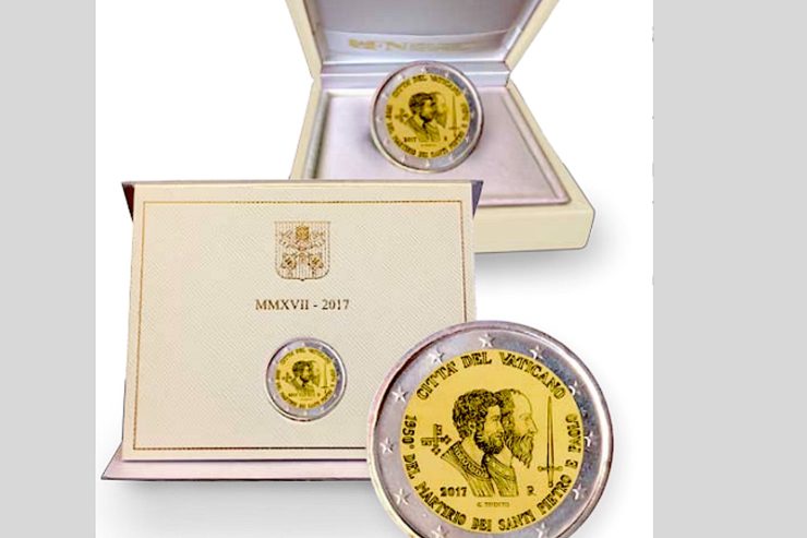 Il Vaticano emetterà il 1° giugno 2017 una moneta commemorativa dal valore facciale di 2 euro per celebrare il 1950º anniversario del martirio dei Santi Pietro e Paolo. Lo ha annunciato martedì 9 maggio l’Ufficio Filatelico e Numismatico dello Stato della Città del Vaticano.