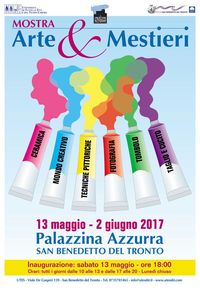 SAN BENEDETTO DEL TRONTO – Sabato 13 maggio 2017 alle ore 18 l’Utes inaugura, alla Palazzina azzurra, una mostra delle opere realizzate dagli allievi dei corsi d’arte e mestieri che l’associazione, da molti anni, indice con successo nell’ambito delle sue diverse iniziative.