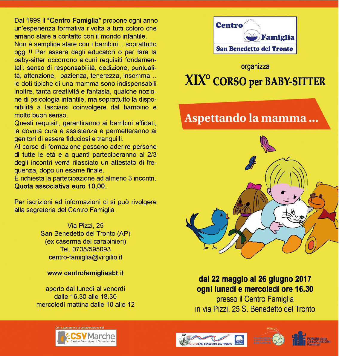 Per informazioni e iscrizioni al corso per baby-sitter è possibile contattare la segreteria del Centro Famiglia al numero 0735 595093 o all’indirizzo centro-famiglia@virgilio.it. È richiesta una quota di adesione di 10,00 euro.
