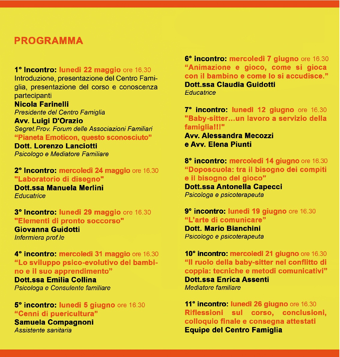 Il corso si svolgerà dal 22 maggio al 26 giugno 2017 e conta 11 incontri con gli esperti. Durante il corso saranno forniti i concetti base di puericultura e primo soccorso, di psicologia e sviluppo psi-evolutivo del bambino e una serie di spunti per giocare insieme e organizzare il tempo insieme tra compiti e gioco. Gli incontri si svolgeranno il lunedì e il mercoledì dalle ore 16.30 alle ore 18.30 e a quanti parteciperanno ai 2/3 degli incontri verrà rilasciato un attestato di frequenza.