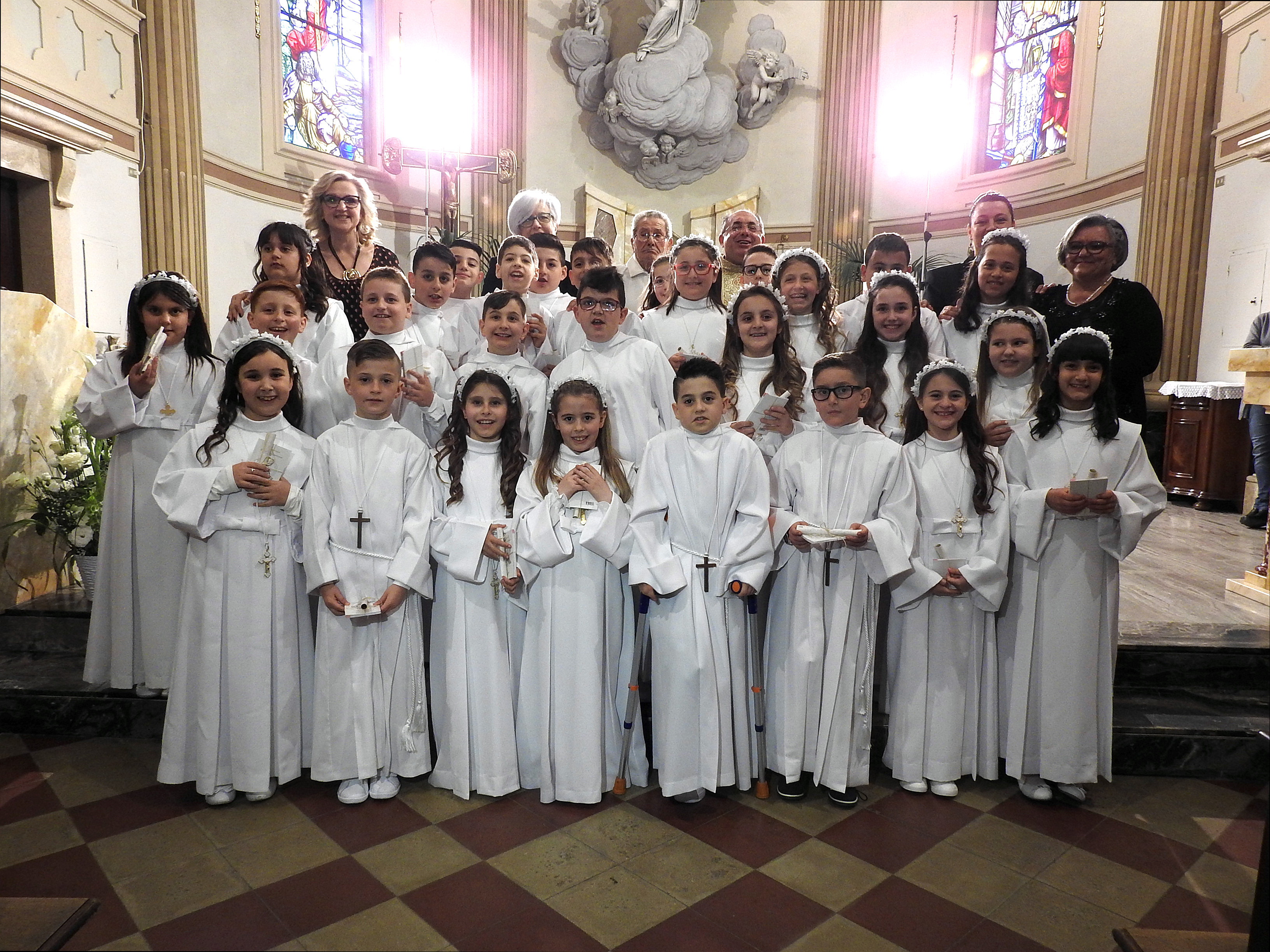 COMUNANZA – Domenica 7 maggio a Comunanza, nella chiesa di Santa Caterina d’Alessandria , 26 bambini hanno ricevuto il sacramento dell’Eucarestia. Si è arrivati a questa celebrazione dopo un anno catechistico sofferto a causa degli eventi sismici e metereologici ma grazie alla tenacia del parroco Don Dino Straccia , delle famiglie e delle catechiste (nello specifico Adele Massacci, Gianna Basili, Nadia Giannini e OriettaOrtolani) domenica abbiamo assistito ad un rito intenso e partecipato. Auguriamo a questi bambini che Gesù, nel viaggio della vita sia per loro Luce nel buio , Fede nel dubbio, e Gioia nella tristezza.