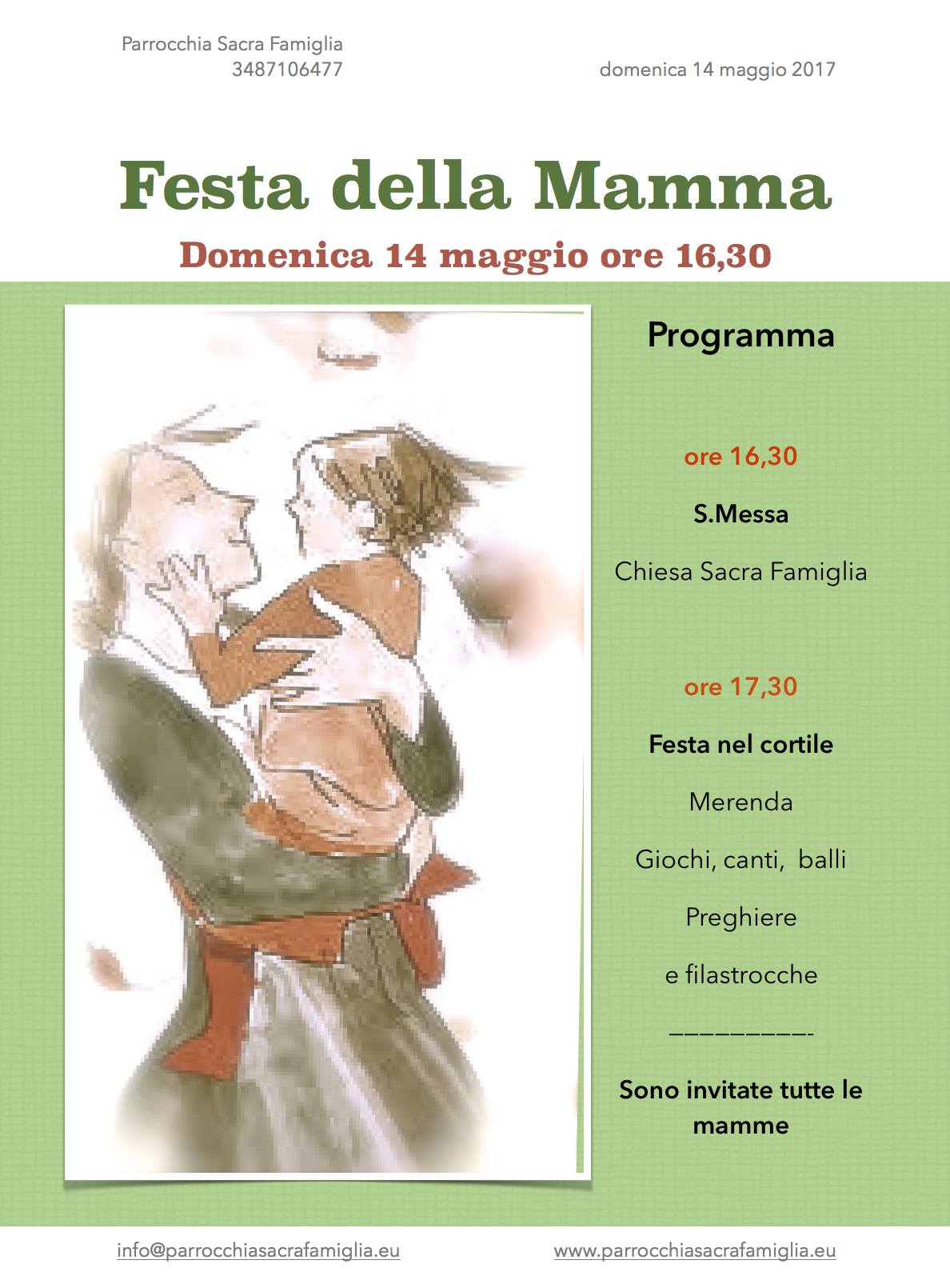 Il programma prevede la celebrazione della S. Messa alle ore 16:30 con la benedizione di tute le mamme, cui seguiranno i festeggiamenti nel cortile parrocchiale con merenda giochi, canti, balli, preghiere e filastrocche. Sono invitate tutte le mamme