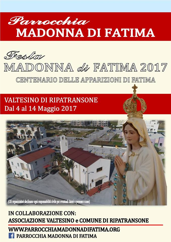 Informazioni dettagliate sul programma sono disponibili in Parrocchia, sul nostro Sito Internet www.parrocchiamadonnadifatima.org e sulla nostra Pagina Facebook Ufficiale Parrocchia Madonna di Fatima (https://www.facebook.com/ParrocchiaMadonnaDiFatimaValtesinoRipatransoneAp/?ref=page_internal )