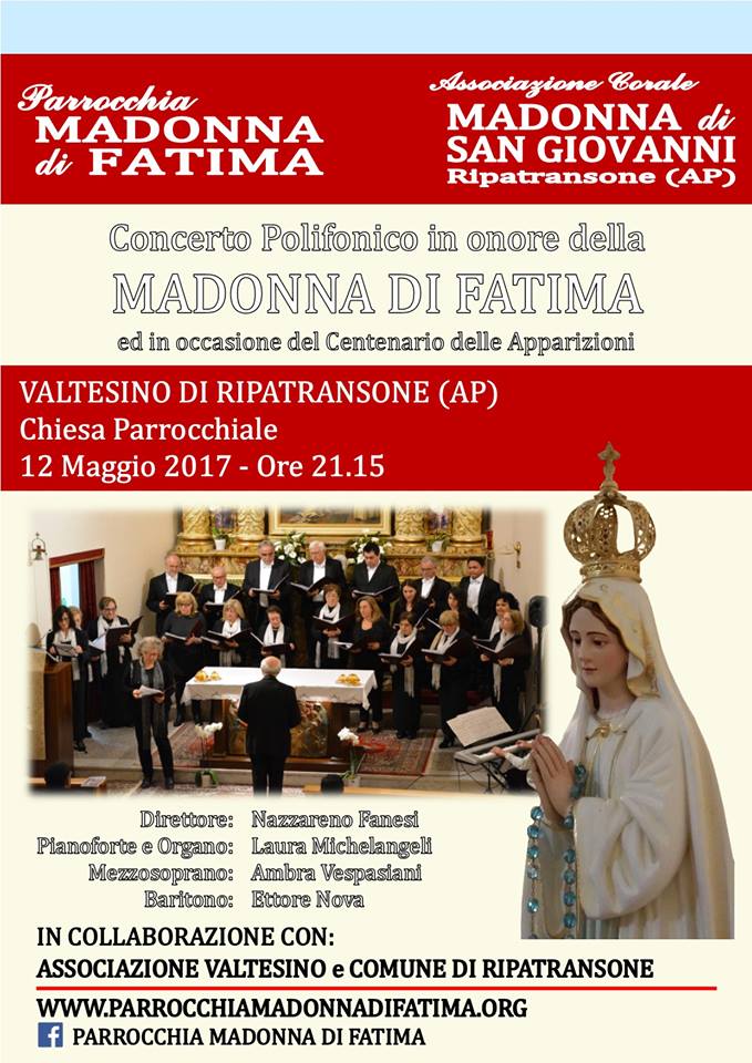 Come da tradizione a fare da preludio al fine settimana della nostra Festa Parrocchiale è il Concerto che la Corale “Madonna di San Giovanni” di Ripatransone propone in onore della Madonna di Fatima in programma per stasera, Venerdì 12 Maggio, alle ore 21.15 nella nostra Chiesa Parrocchiale.